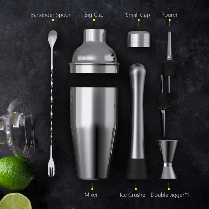 This is a set of fine quality cocktail making set, with 6 pcs different tool, all tools are made of stainless steel material, tools crafted cocktail bar set as used by the pro cocktail mixers, prevents from absorption and discoloration, with fine durability. An perfect gift for both starter and professional mixers alike, as all essential tools are included. You can have a try.