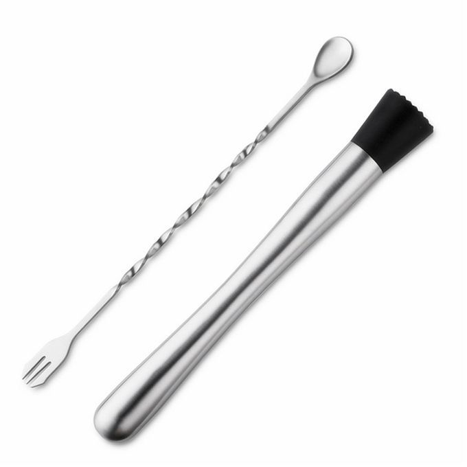 Cocktail set have all essential tools, contains 1 * 550ml/750ml Shaker(optional), 1 * Fork-Spoon, 1 * Ice Crusher, 1 * 20/40ml Jigger, 2 * Pourer.