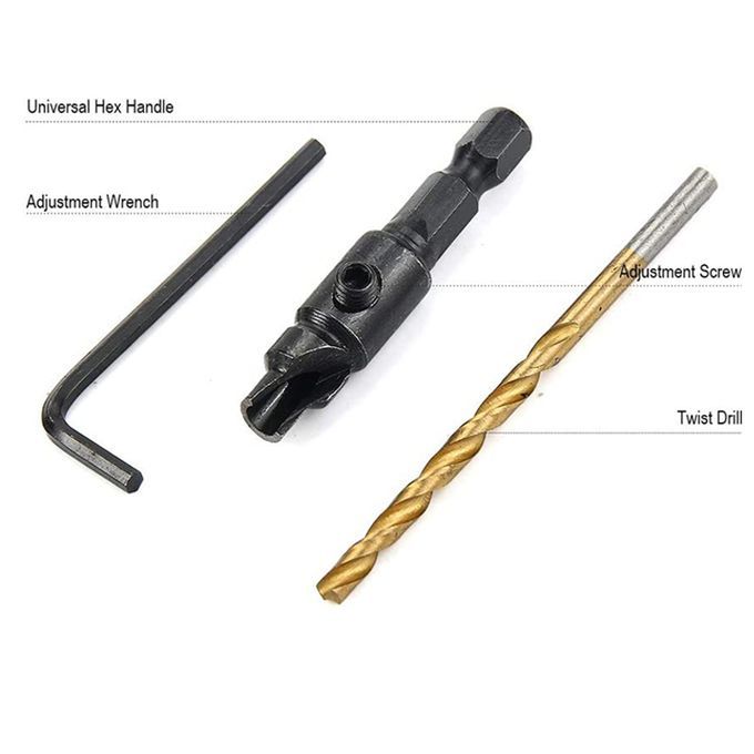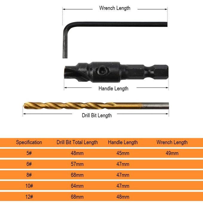 1 x #5 Countersink Drill Bit1 x #6 Countersink Drill Bit1 x #8 Countersink Drill Bit1 x #10 Countersink Drill Bit1 x #12 Countersink Drill Bit1 x L-wrench