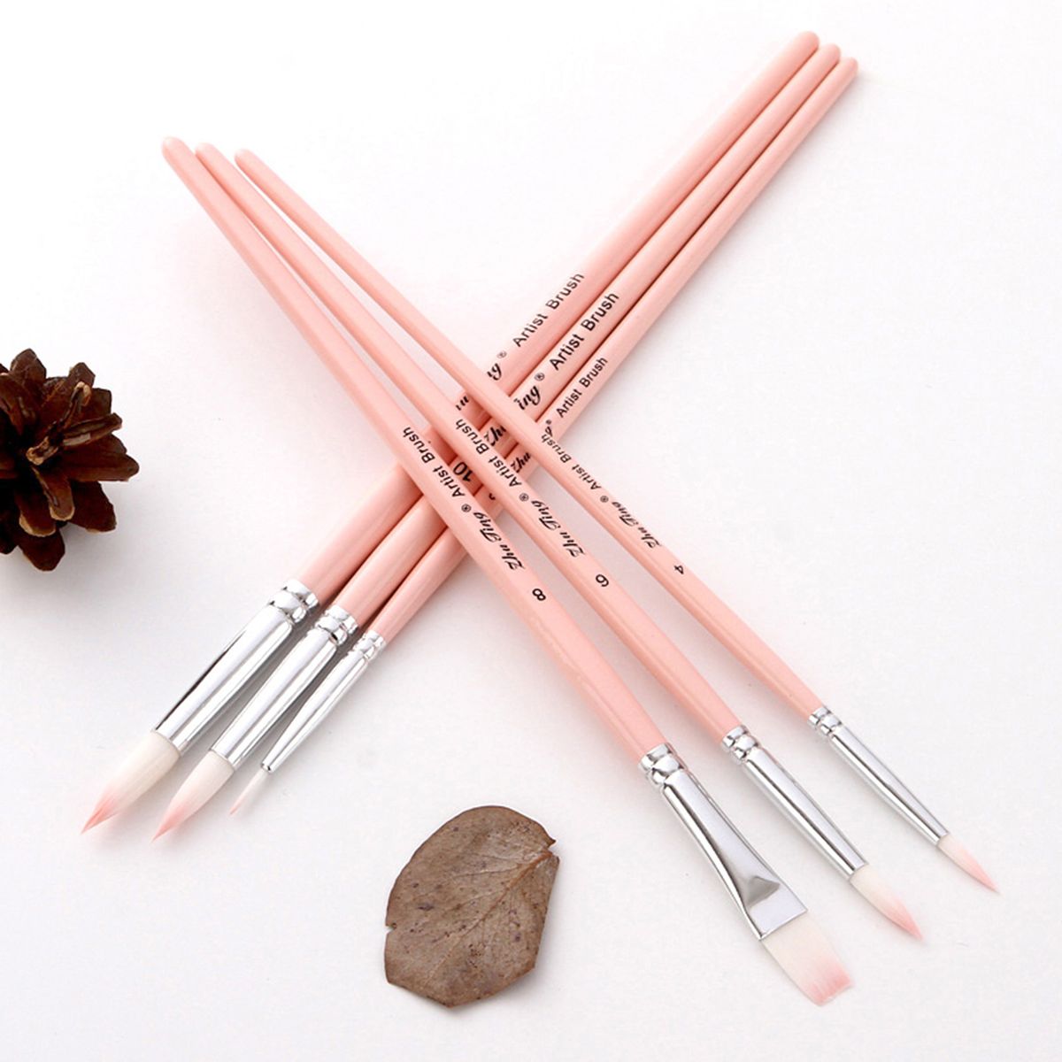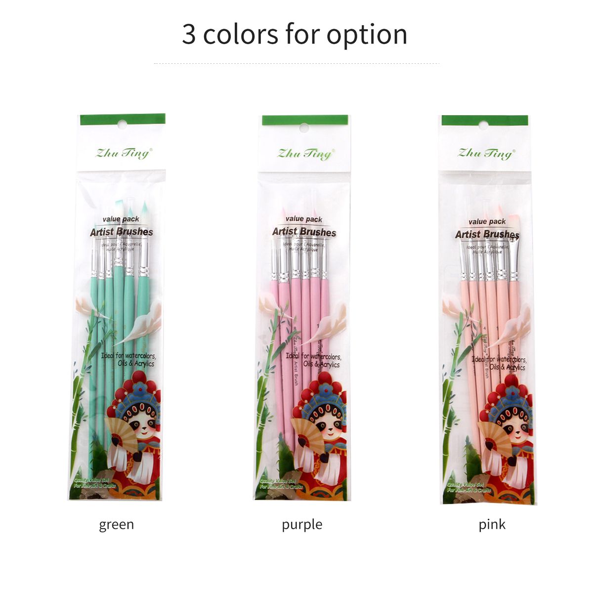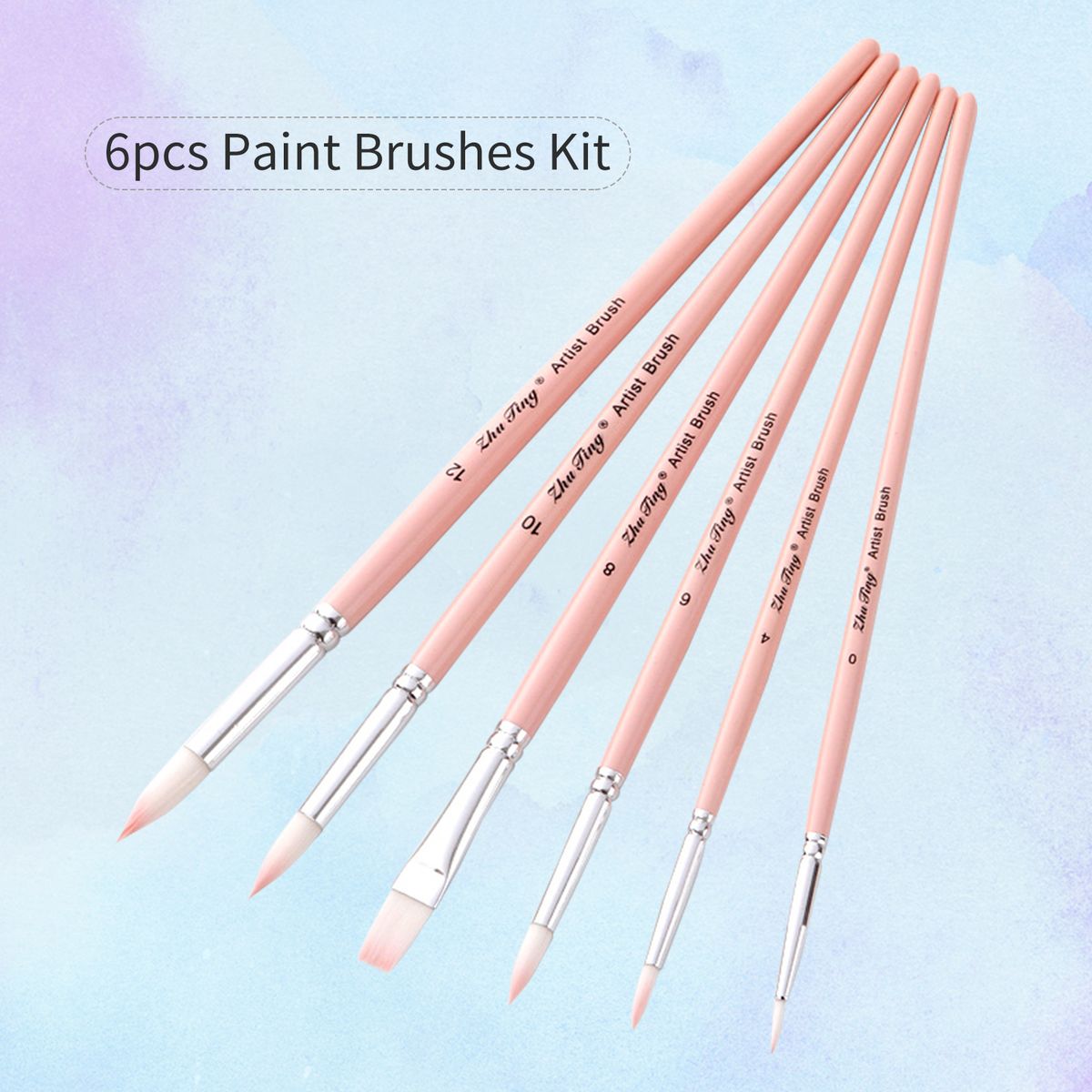 ▶ 6pcs paint brushes in various size and shape, and 3 brush colors for you to choose - Green, purple and pink. And this brush set including round brushes (0#,#4,#6,#10,#12) and a 8# flat brush.