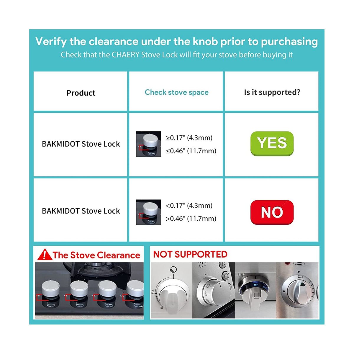 [Universal Fit & Easy Installation] Before purchasing, measure your stove knob to a proper fit. Our Gas Stove Knob Locks have a clearance requirement of 0.17inch to 0.46inch the gas cooktop knob, making for a quick and easy installation by simply sliding the lock behind the knob.