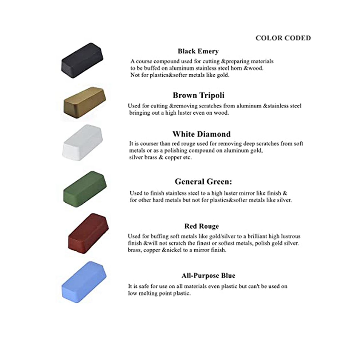 [What you get is your purchase with 6 polishing compound sticks, each compound (black, brown, white, green, red and blue) is 4 ounces, with a total weight of 24 ounces (about 680 grams). This packaging is a precious choice for polishing, which can meet your polishing different materials and realize all the needs you need to complete.