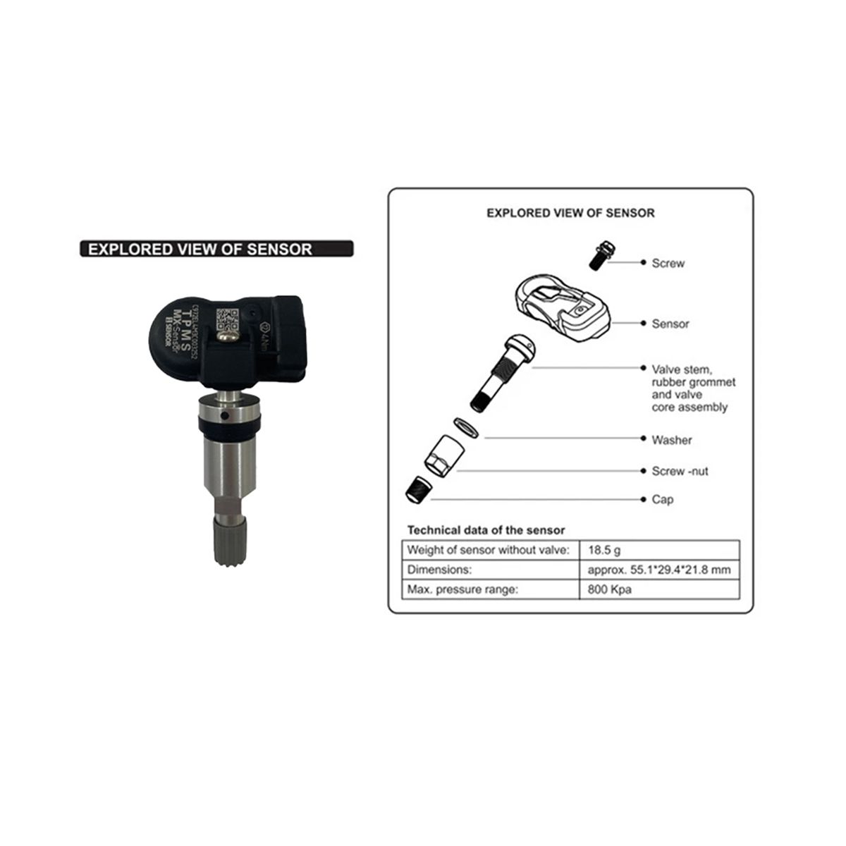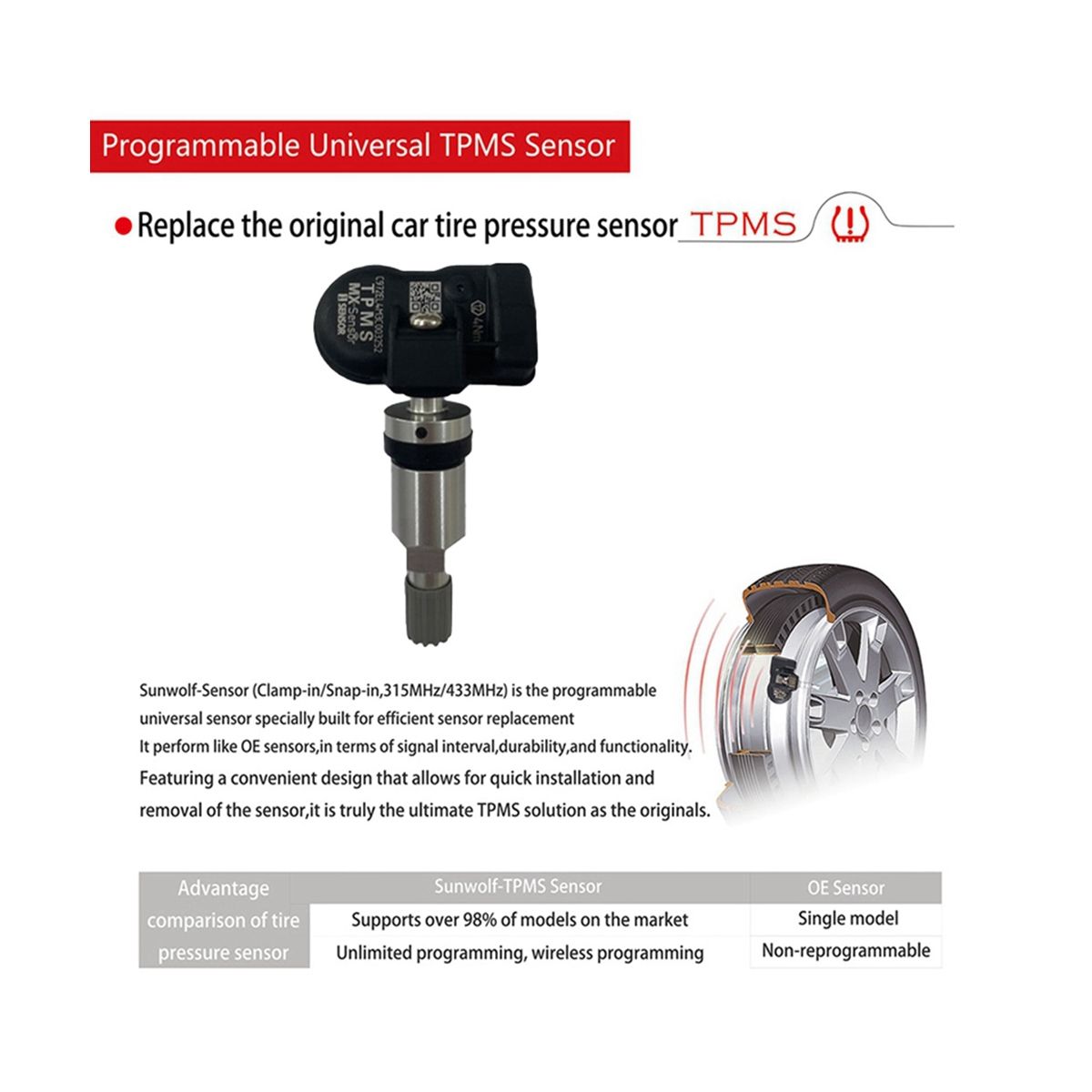 Detailed Information About The Product:1. Sensor (Clamp-in/Snap-in,315MHz/433MHz) is the programmable universal sensor specially built for efficient sensor repment. It perform like old sensors,in terms of signal interval,durability,and functionality. Featuring a convenient design that allows for quick installation and removal of the sensor,it is truly the ultimate TPMS solution.