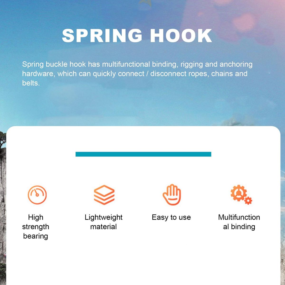 Spring snap hook versatile binding, rigging & anchoring hardware and allow quick connect/ dis-connect of ropes, chains and straps.