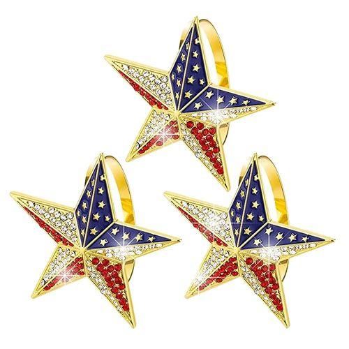 The following is the detailed introduction about our products: Each patriotic napkin ring frame is designed with a five-pointed star, inlaid with transparent, red and blue shiny rhinestones. The colors are from the American flag, making your home full of patriotism.