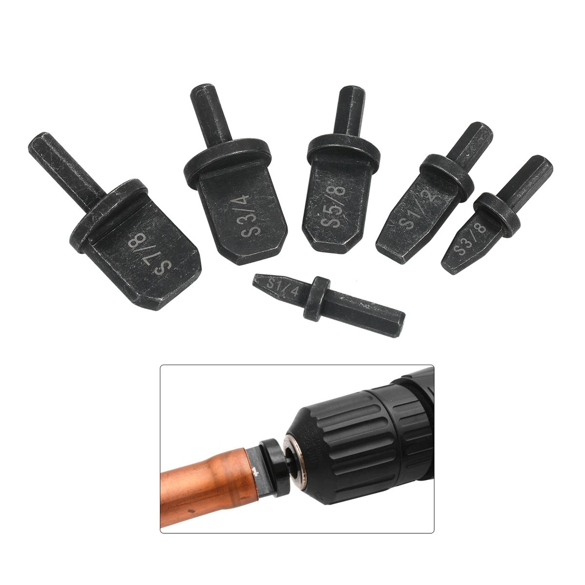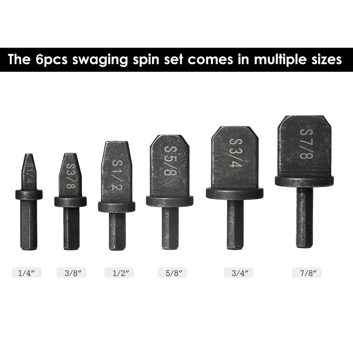 The 6pcs swaging spin set comes in multiple sizes - 1/4 inch, 3/8 inch, 1/2 inch, 5/8 inch, 3/4 inch, 7/8 inch.