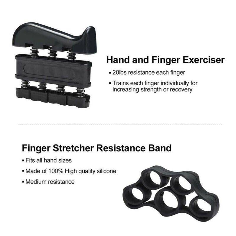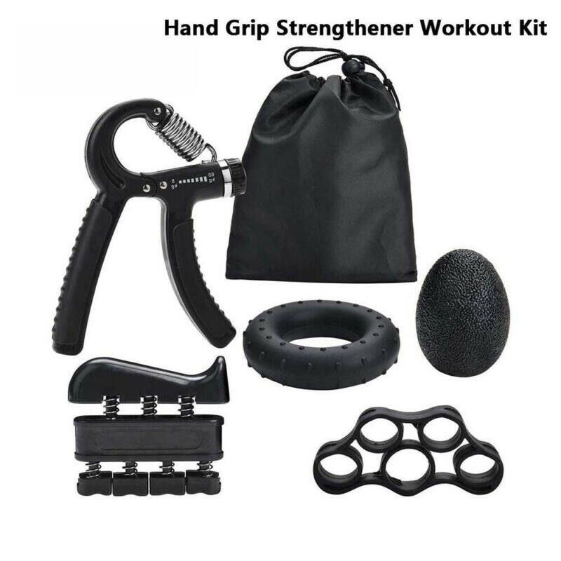 1x Adjustable Hand Grip Strengthener (22-132Lbs). 1x Finger Exerciser (4 Lbs per each finger). 1x Finger stretcher Resistance Band (Light resistance). 1x Hand Strengthener Grip Ring (50lbs resistance). 1x Stress Relief Grip Ball (Medium). 1x Drawstring storage bag