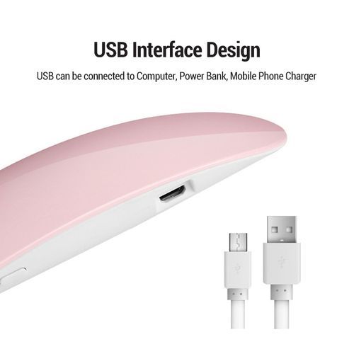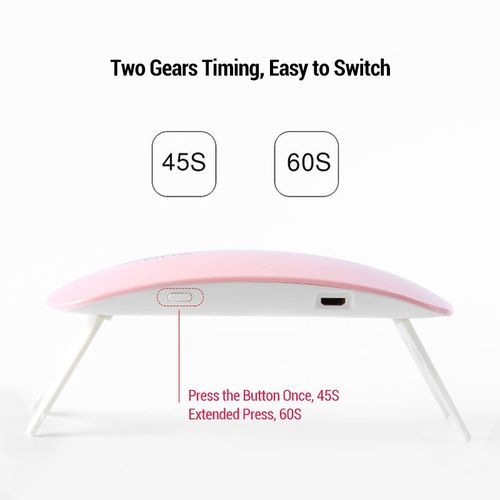 Specifications: Type: Nail Nursing Tool -Material: PC & ABS -Color: Pink White -Power: 6W -Size: 12.7*6.8*5.5cm -Weight: 58g -Fit Gel Type: UV nail gel polish/ LED nail gel polish -Service Life: Approx. 50000 hours -Delay time: 45s/60s -Nail polish is a kind of evaporable product could not be dried by any nail lamp, so please do not use this lamp to dry nail polish. Feature: -2 Time Setting: 45 seconds and 60 seconds. -Press once for time setting 45 seconds, -Long-press 2 seconds for time setting 60 seconds. -All light beads adopt advance technology, -Makes it works with all UV/LED gel nail polish. -Portable size -USB interface Packing Included:(without box) 1x Nail Lamp 1x USB Line