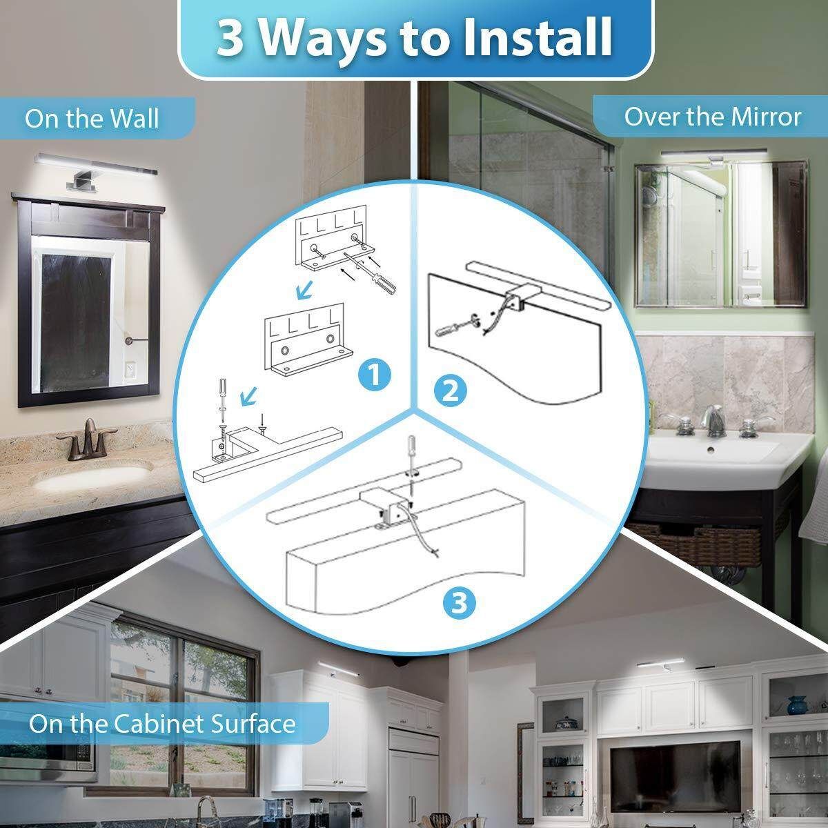 【3 ways for installation】: On the housing surface, over the mirror, on the walls. Bathroom mirror light can be used on mirrors and as cabinet and picture lighting. Thanks to two pre-drilled and removable brackets, the installation is simple and variable on the cabinet and wall.