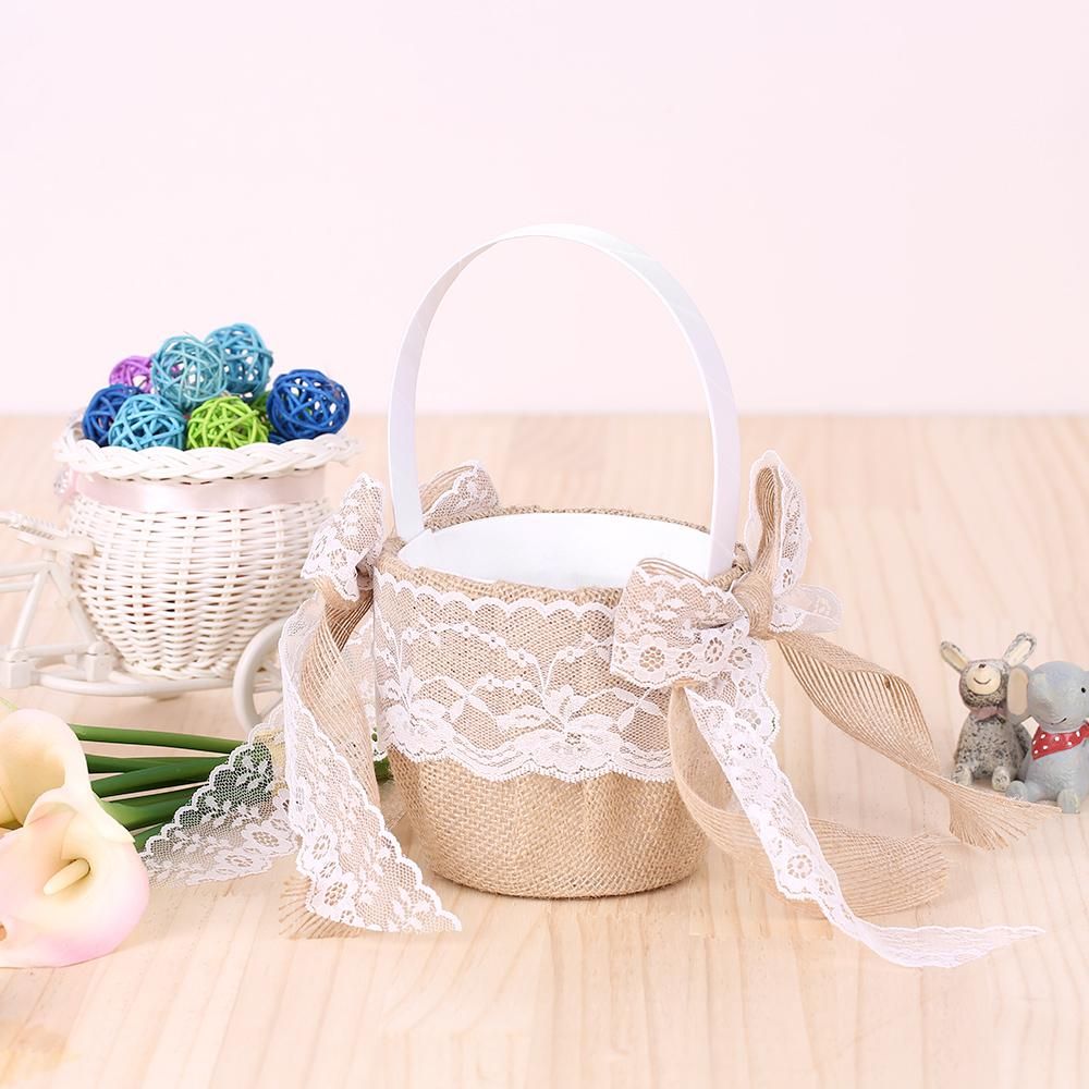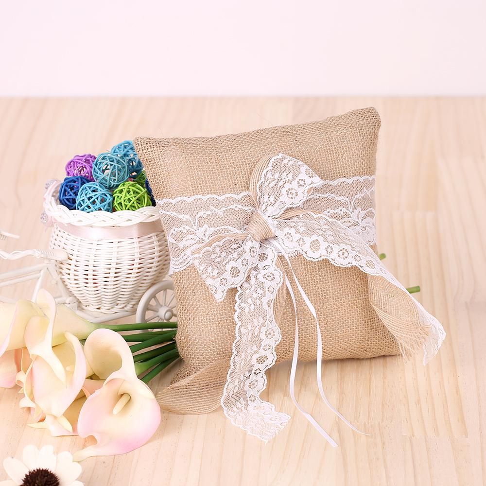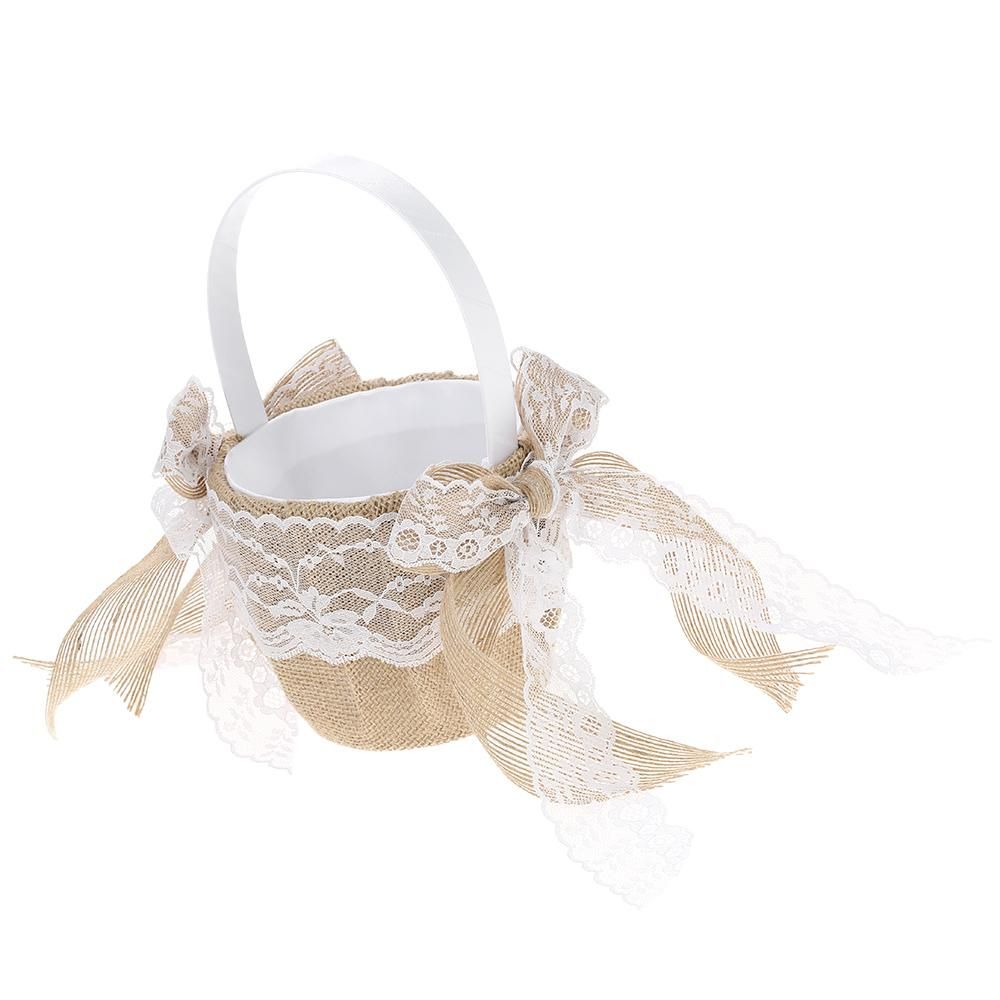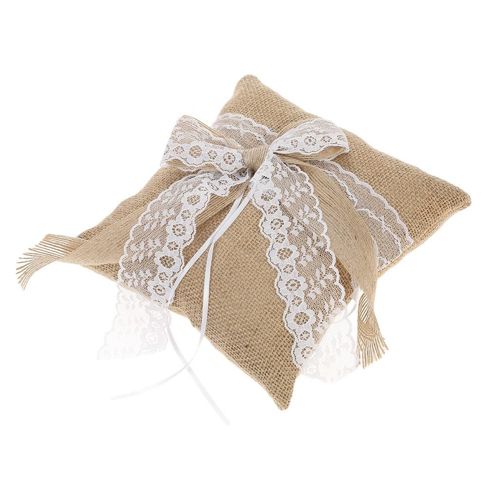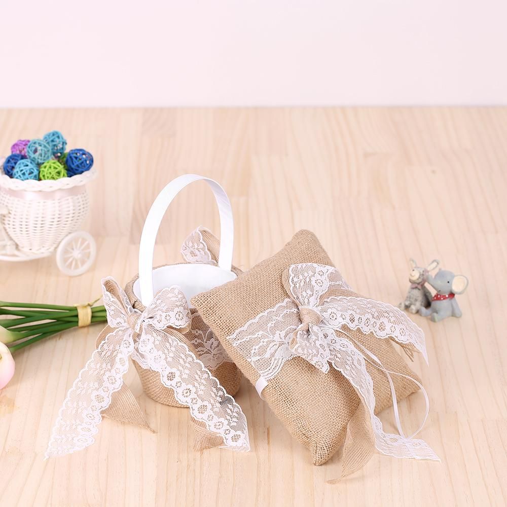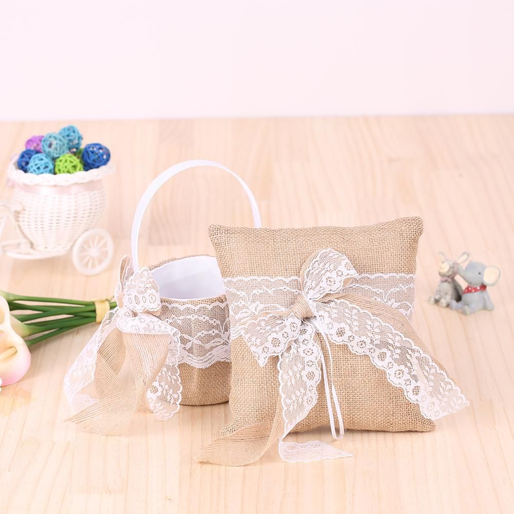 Buy 7 * 7 inches Vintage Burlap Lace Bowknot Ring Bearer Pillow and Rustic Wedding Flower Girl Basket Set in Nigeria