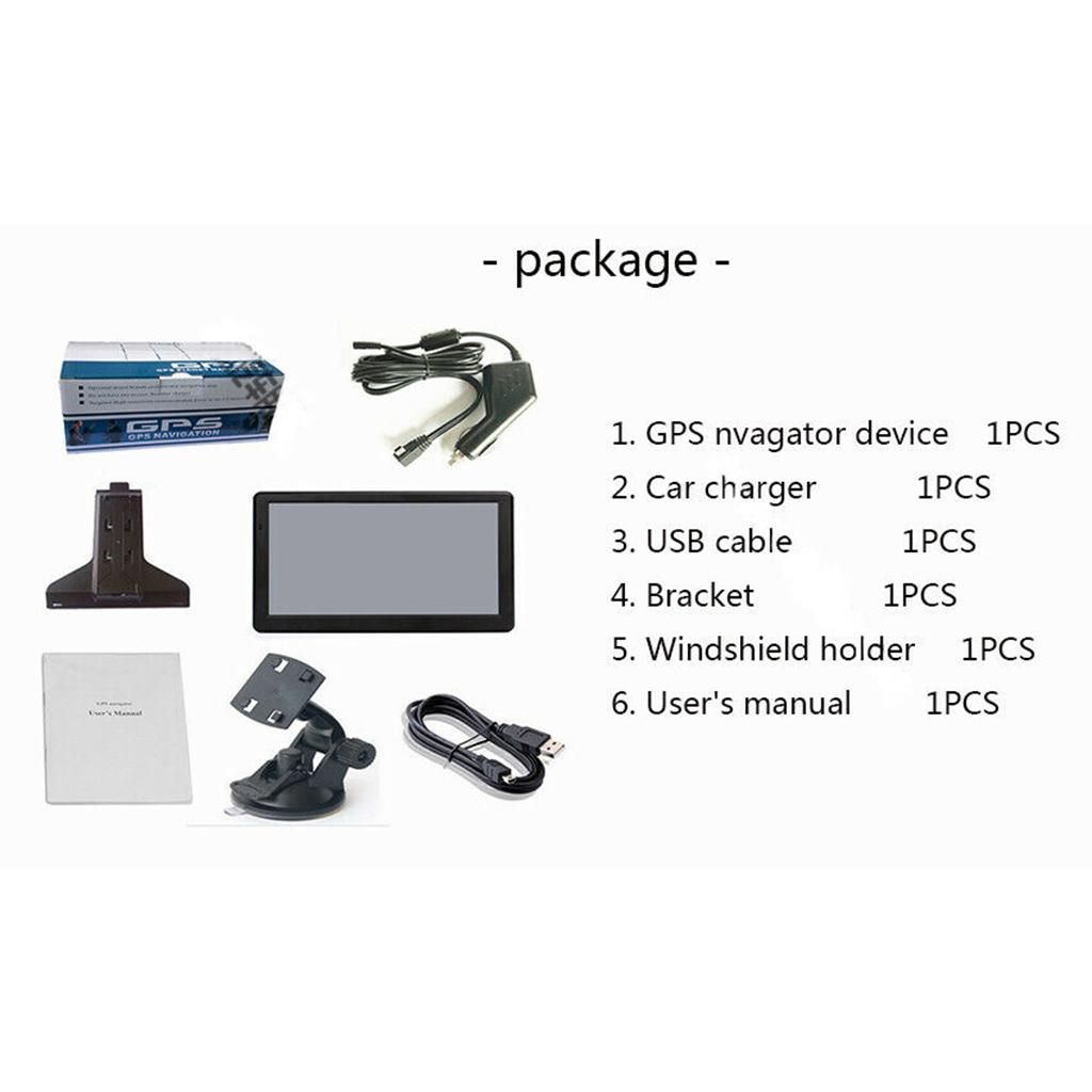 1x 7" Touch Screen Navigation1x Bracket1x Suction Holder1x USB Cable1x Car Charger1x User Manual