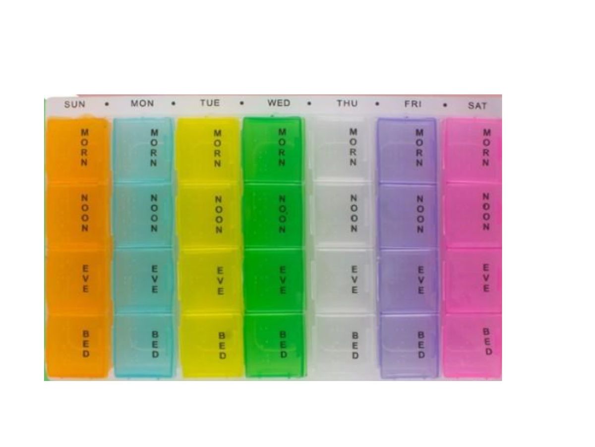 This Multicoloured Weekly Pill Organizer Box is simple yet handy, perfect for a person who needs to take pills different times of the day.