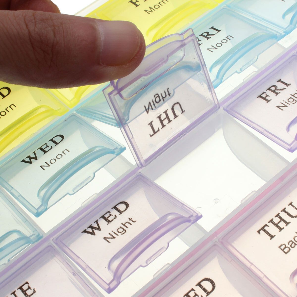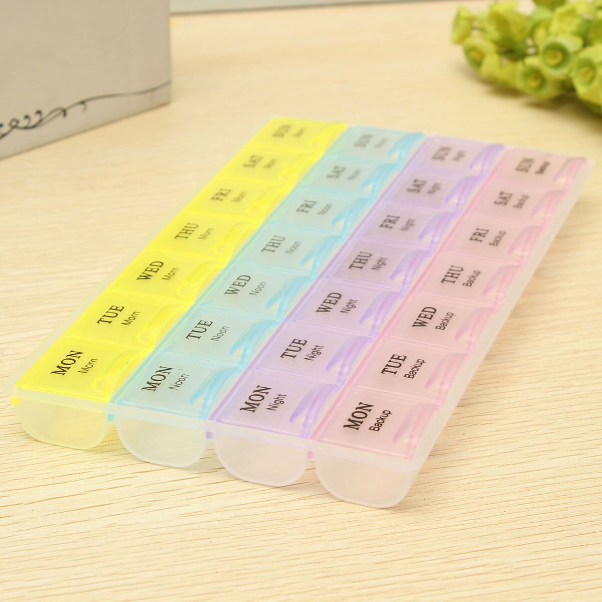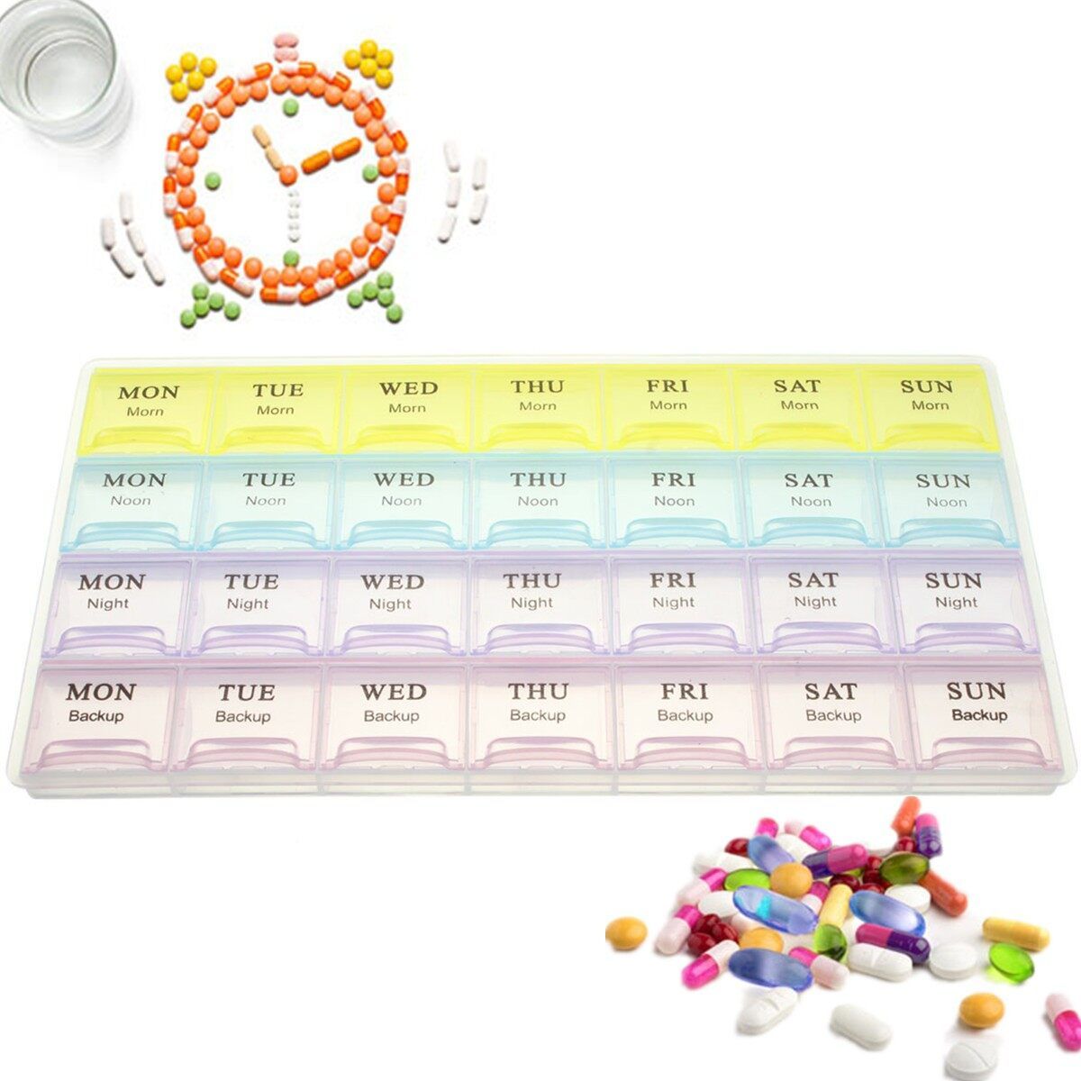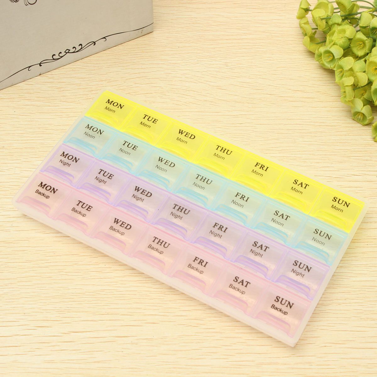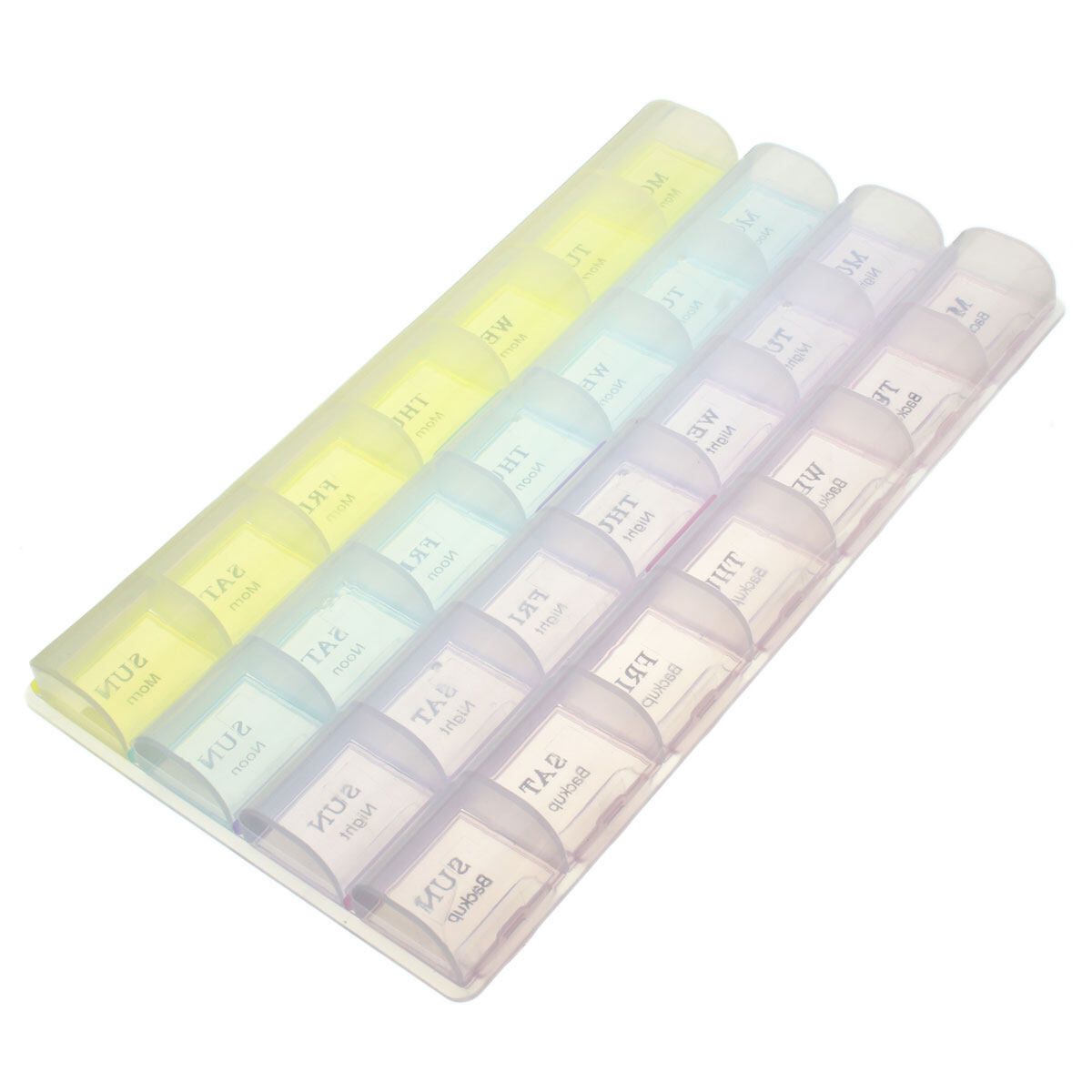 This plastic box has 28 separate compartments to hold the or tablets for each day of the week