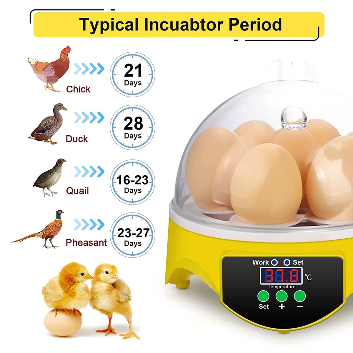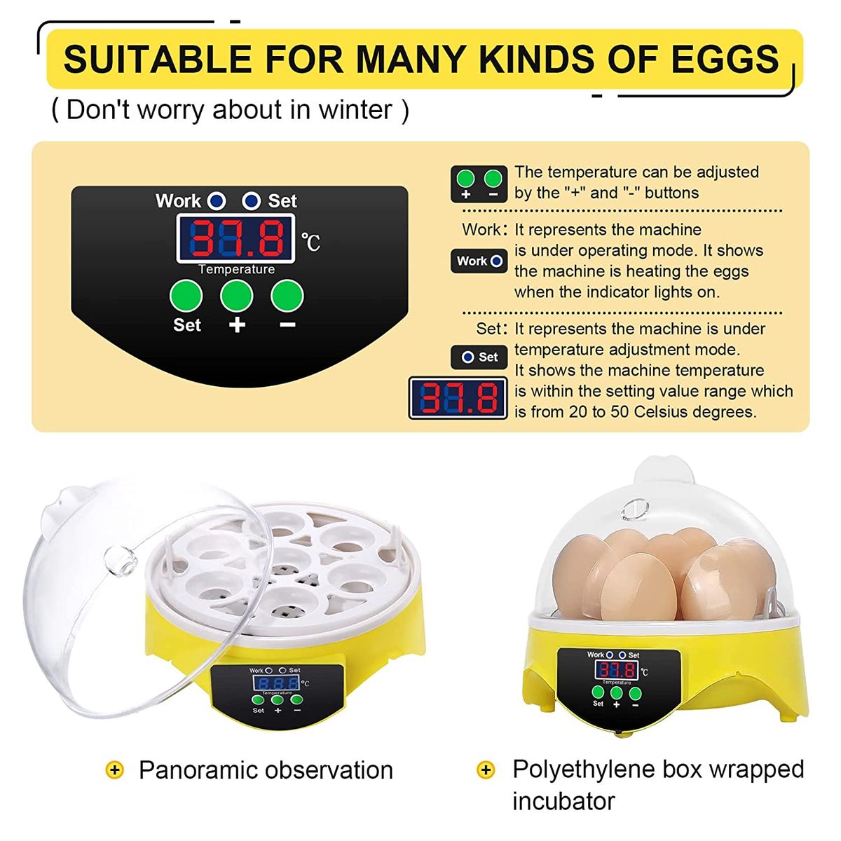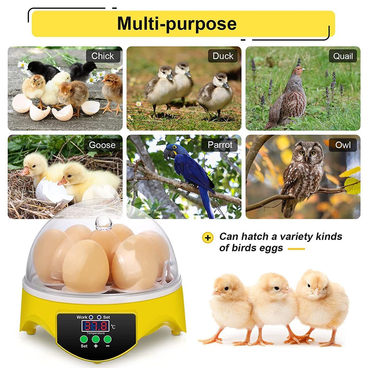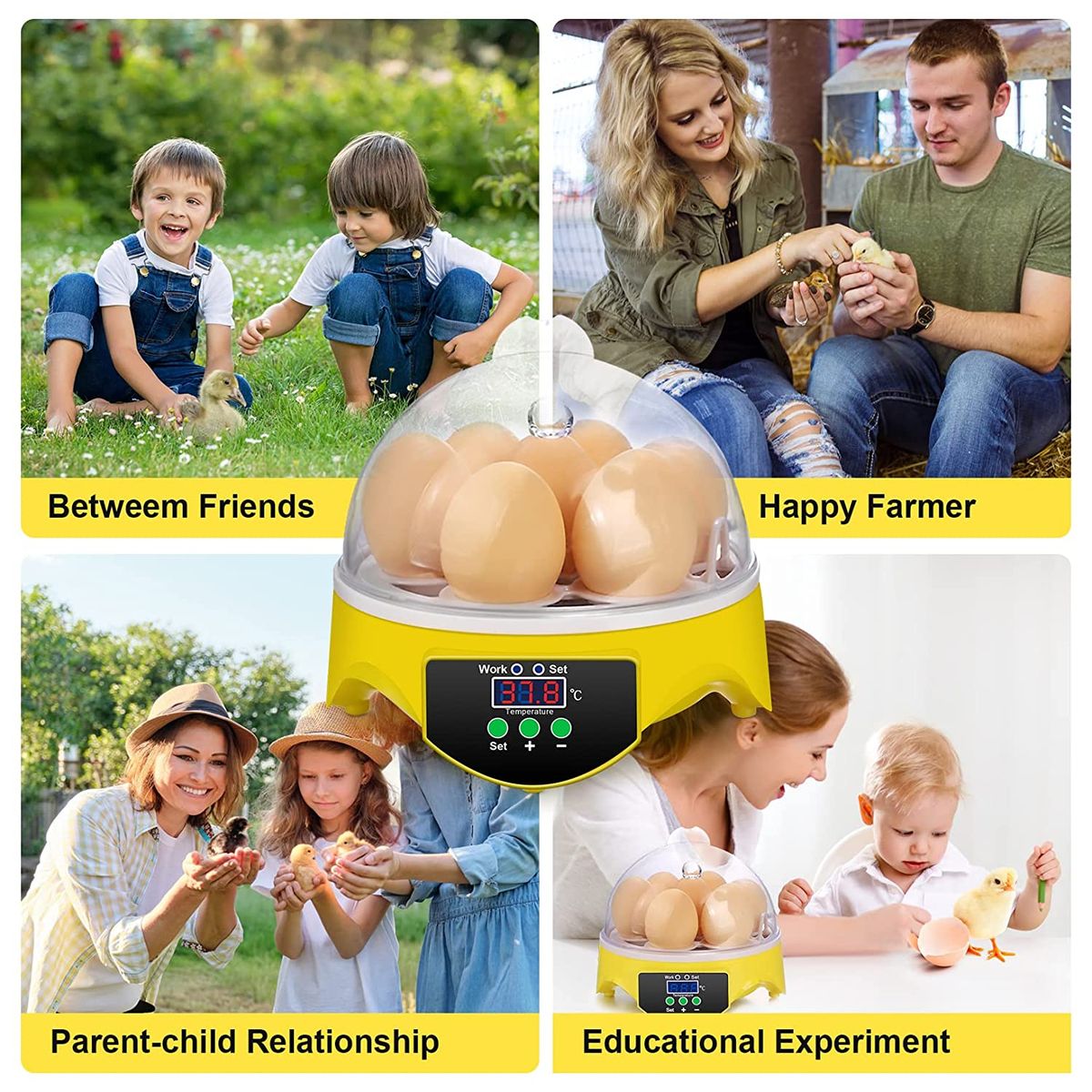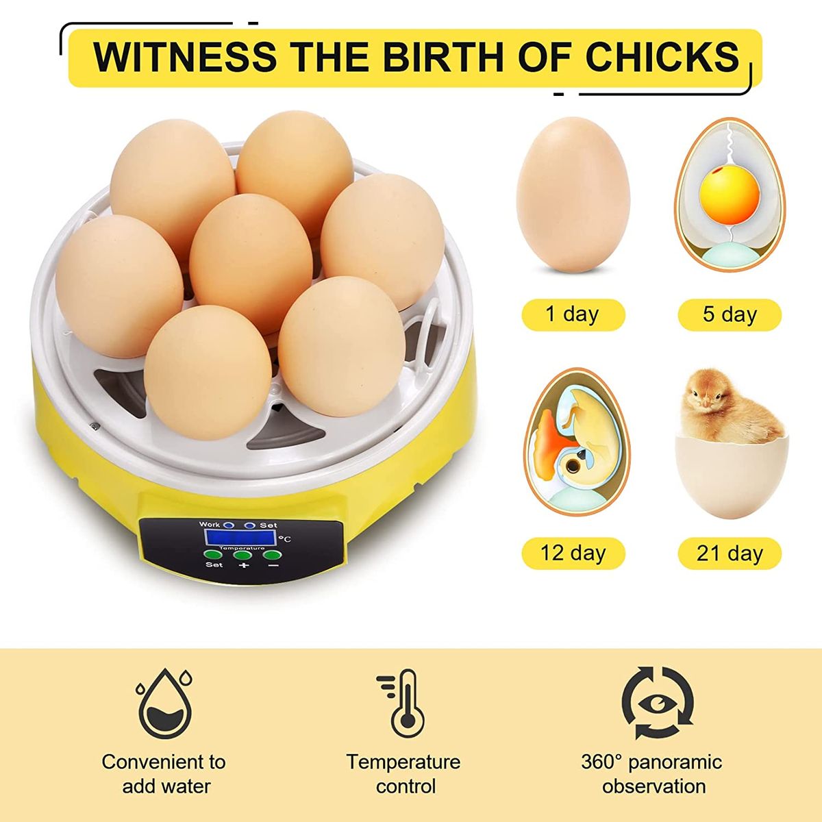 DURABLE & SIMPLE: Our mini incubator fits 7 eggs, made of durable healthy ABS material for easy cleaning; Transparent design for excellent visibility to observe the working principle of the machine and egg hatching situation!