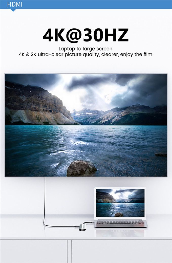 7-in-1 Hub ports: RJ45*1 (100Mbps), USB 2.0 *1, USB 3.0*1, 4K HD@30Hz*1, PD 87W *1, SD*1, TF*1.