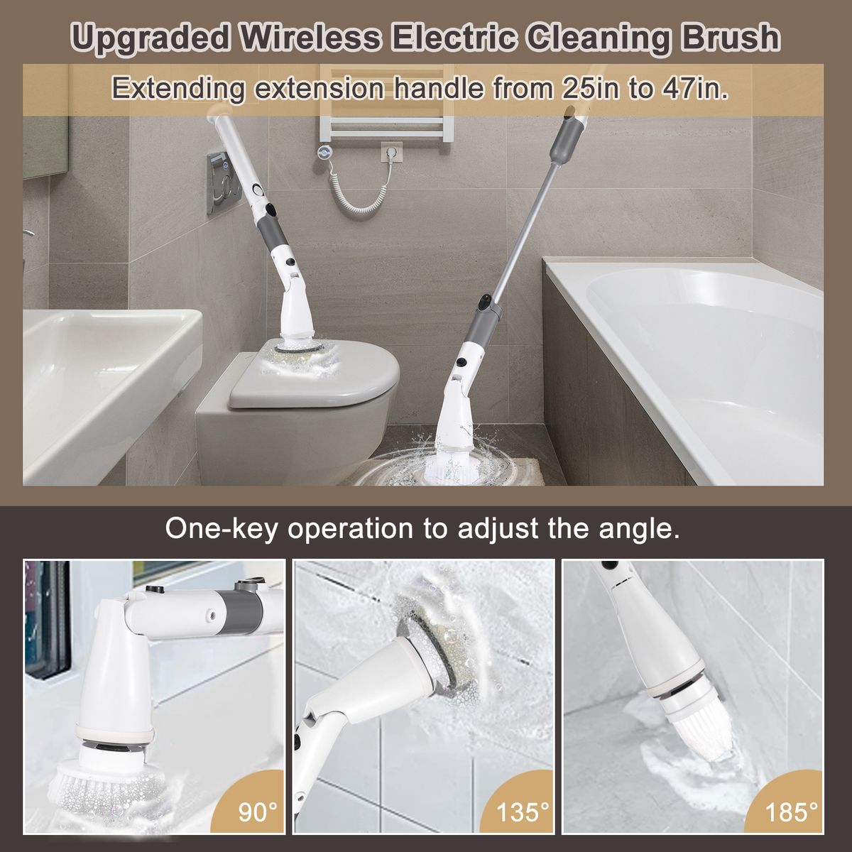 Equipped with detachable extension handle, the electric cleaning Brush can extend from 25in to 44in without bending over to clean. The angel of brush heads can be adjusted as 90 deg;/135 deg;/180 deg;with one-key operation for cleaning without dead ends.