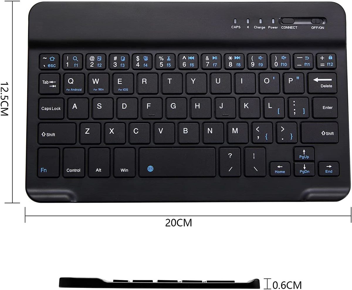 Light portable and compact: This keyboard is much lighte*, smaller than traditional keyboard. You can easily carry it without taking up more space on your desk or bag. 7 inch keyboard dimensions: 20 x 12.5 x 0.6 cm, weight: 128g. 【Size: 7.87 x 4.92 x 0.24 inch, weight: 4.52 ounce/0.28pounds】