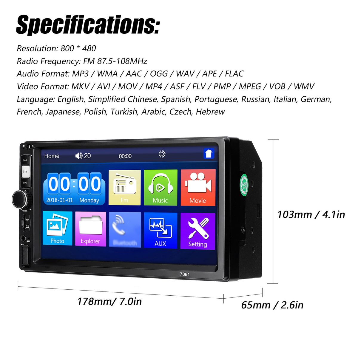 Support U-disk/TF card/AUX/BT to play audio, video and picture, compatible with various file formats.