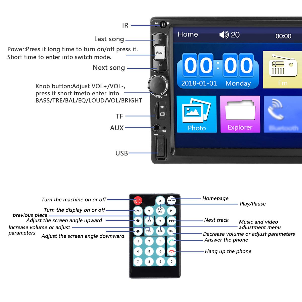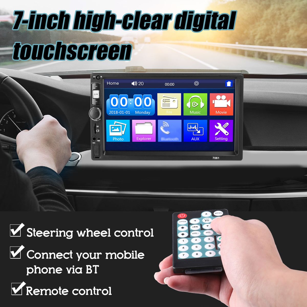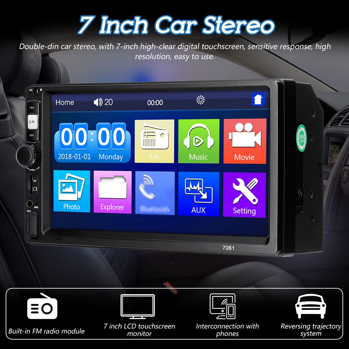 Double-din car stereo, with 7-inch high-clear digital touchscreen, sensitive response, high resolution, easy to use.