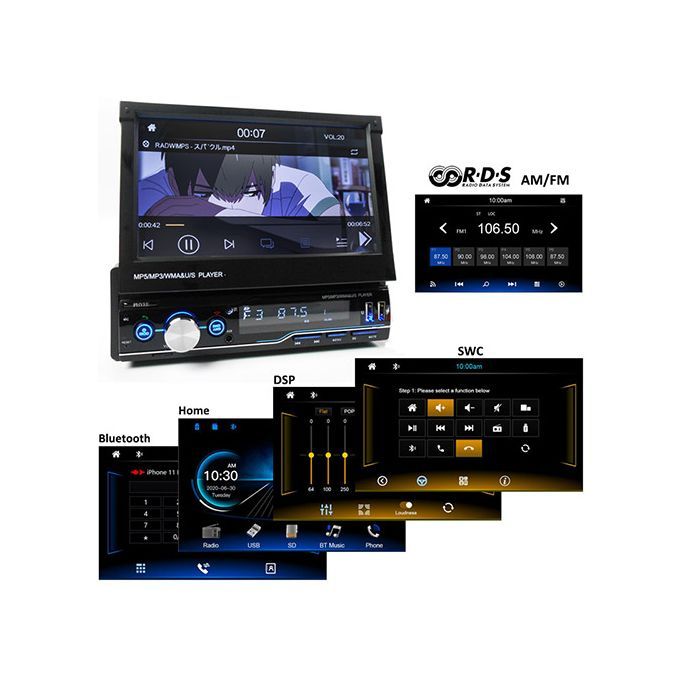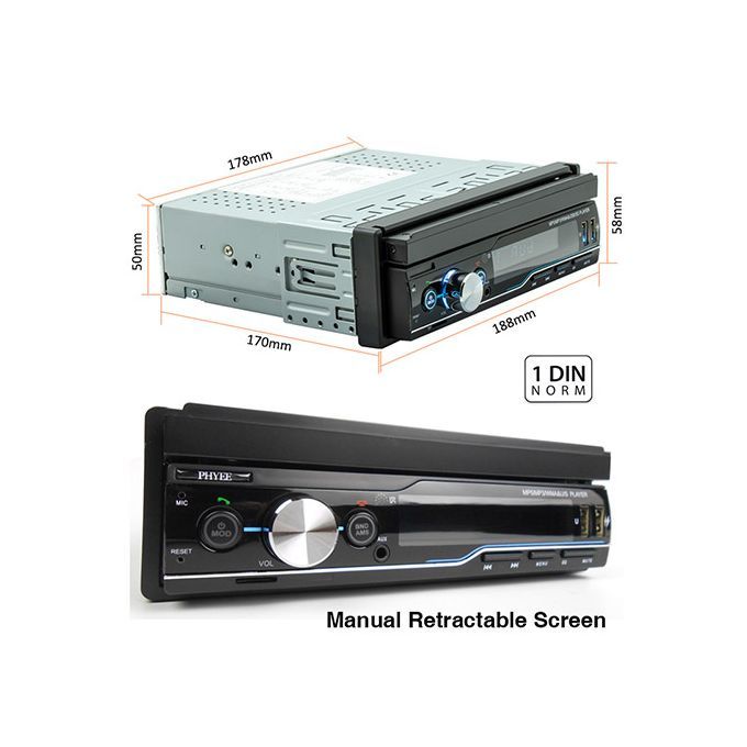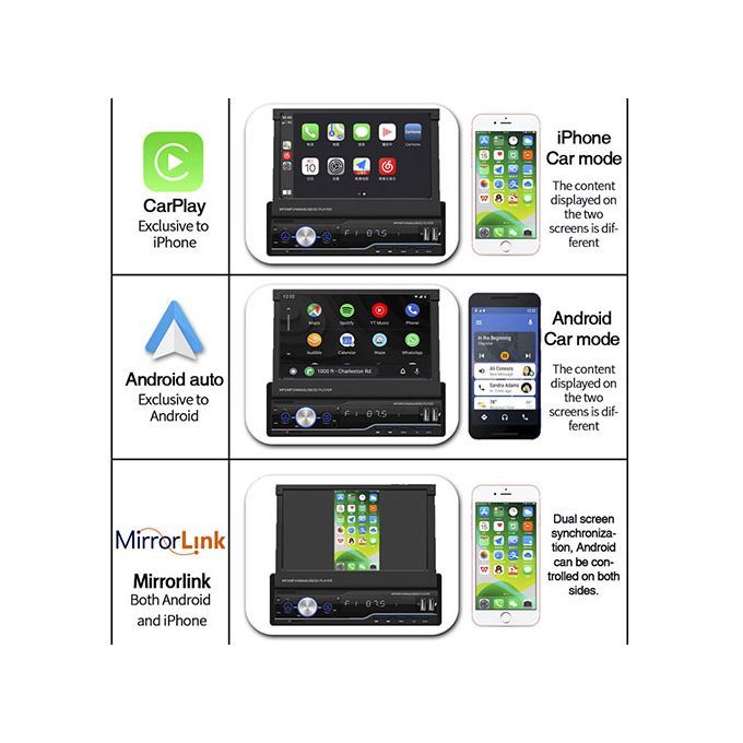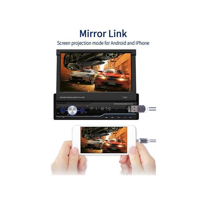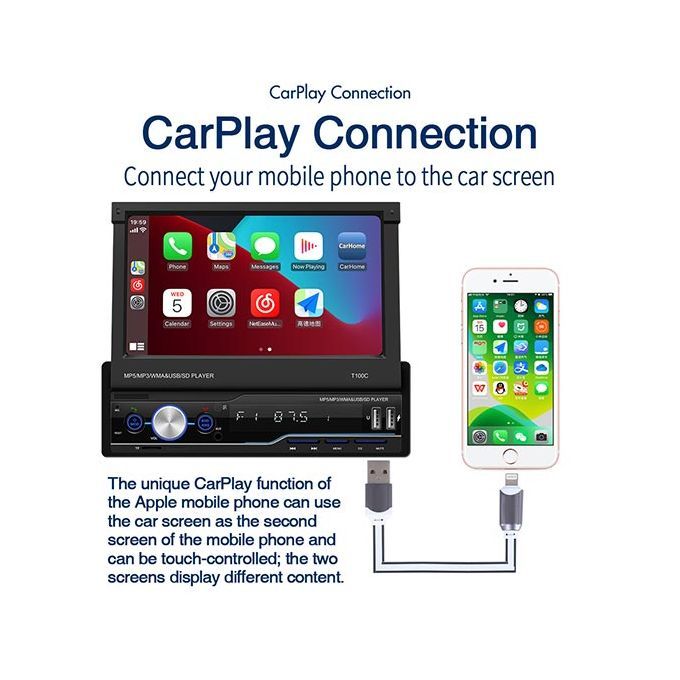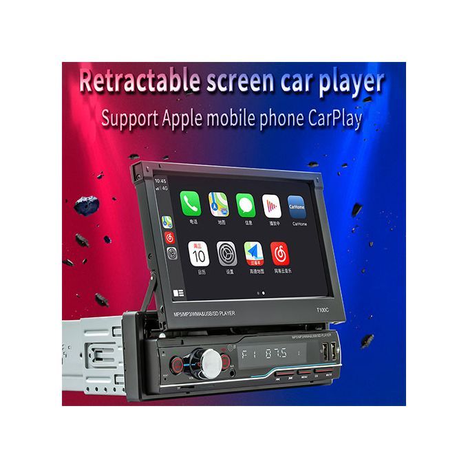 *Standard 1 DIN CarPlay radio head unit T100C*7 inch touch screen, manual retractable screen*1024*600 resolution display*Apple CarPlay (Wired) is used for iPhone, Andorra car (Wired) is used for Android phones*Mirror link (connected) for the latest Android and the latest iOS*Android mirror link requires application installation and Bluetooth connection*MP3/MP5 player*AM/FM stereo digital receiver with RDS function*Car Bluetooth function*Bluetooth A2DP wireless music playback*Bluetooth hands-free function*Bluetooth phone book*Built-in microphone*USB interface, support up to 32 GB (FAT 32 format)*USB charging when the phone is connected with CarPlay and mirroring*Input jack for audio input*Support reverse camera input*Support steering wheel control (universal analog)*Support video input and output*Support both car screen and external screen display.*Real-time HD video decoding (720 p, 1080 i, 1080 p), h 264, mpeg 1-2-4, divx, hardware accelerated JPEG decoding*Support AHD (720 p 25/30) and cvbs signal automatic recognition input*Blue button backlight*SREEN brightness setting*10 band audio EQ settings