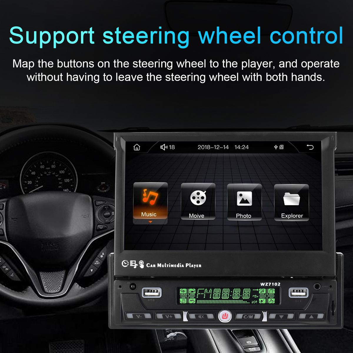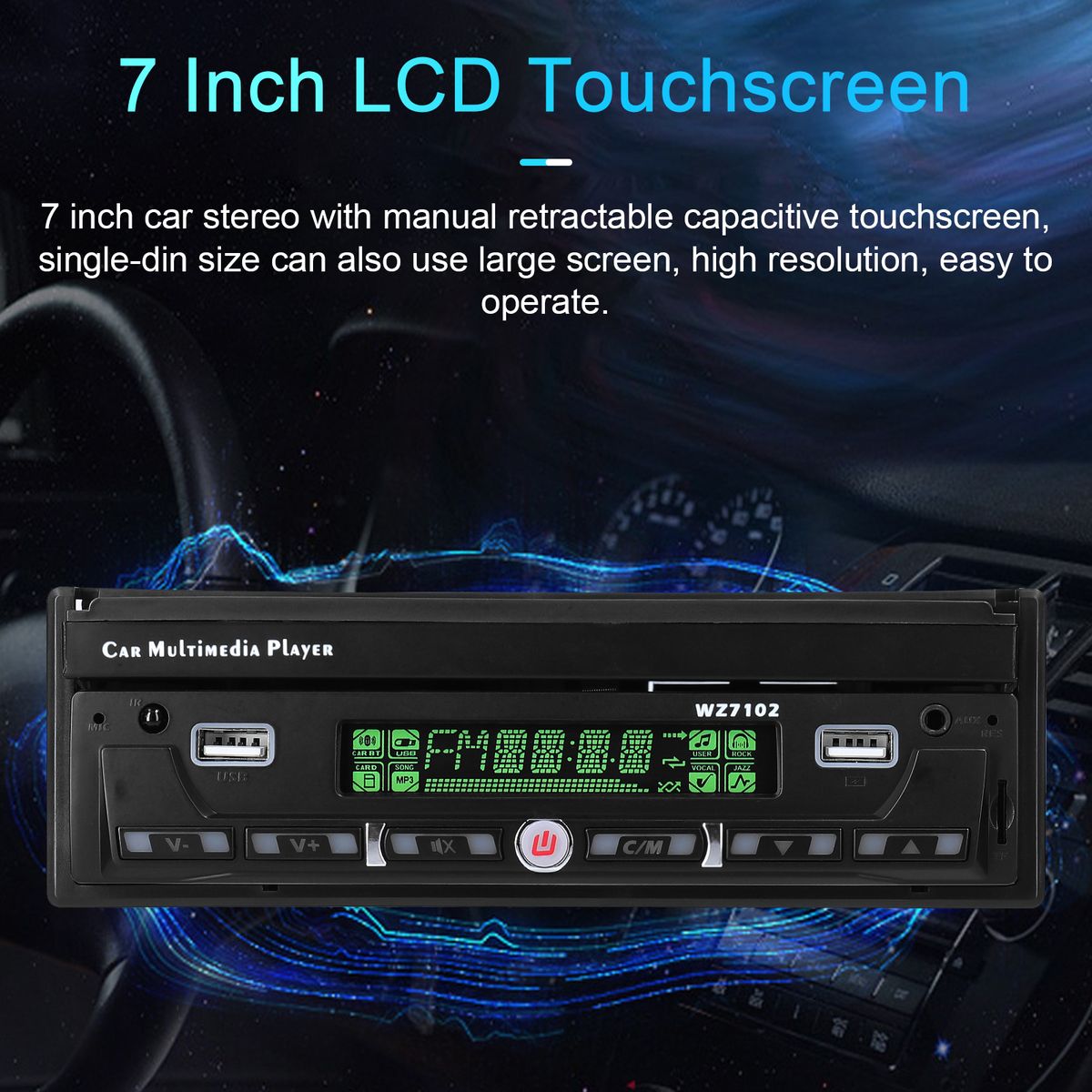 7 inch car stereo with manual retractable capacitive touchscreen, single-din size can also use large screen, high resolution, easy to operate.