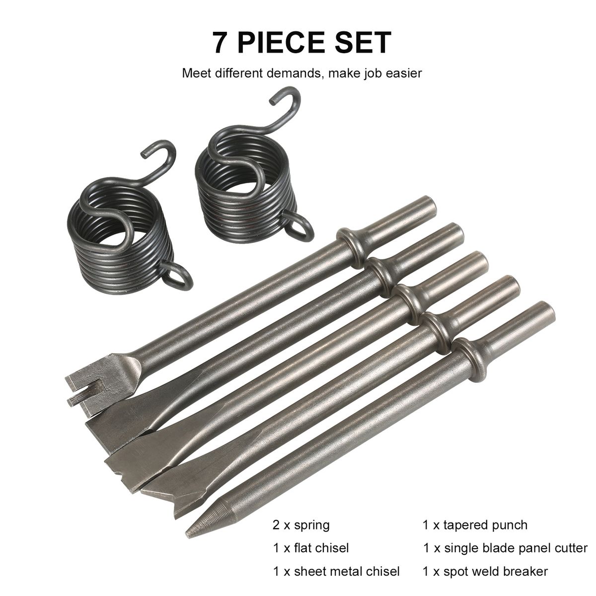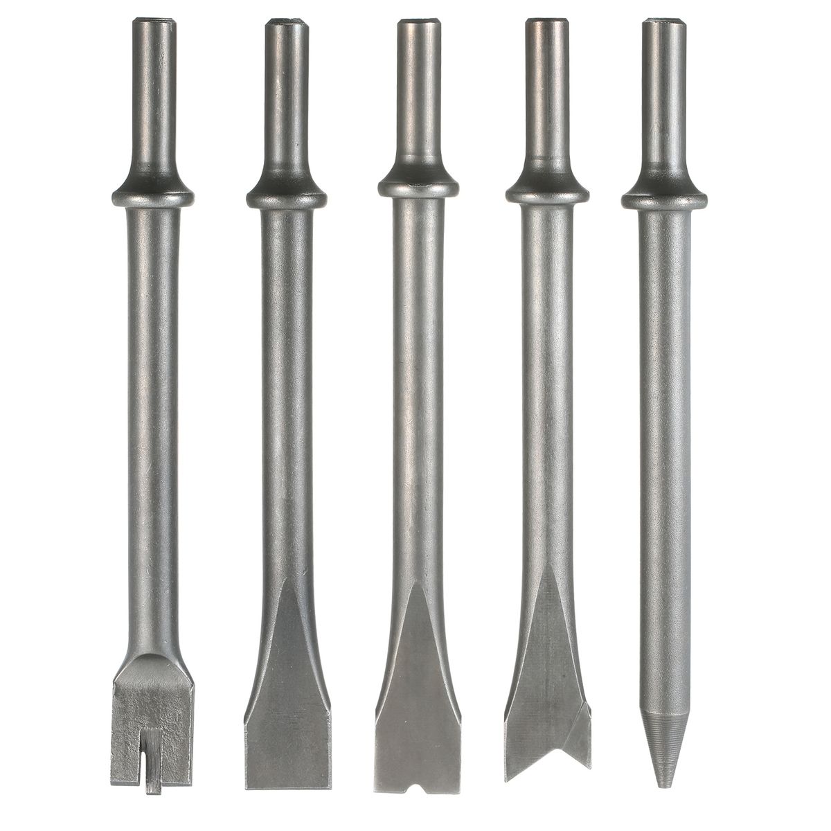 5 Chisels: 1 x tapered punch, 1 x flat chisel, 1 x single blade panel cutter, 1 x sheet metal chisel, 1 x spot weld breaker.