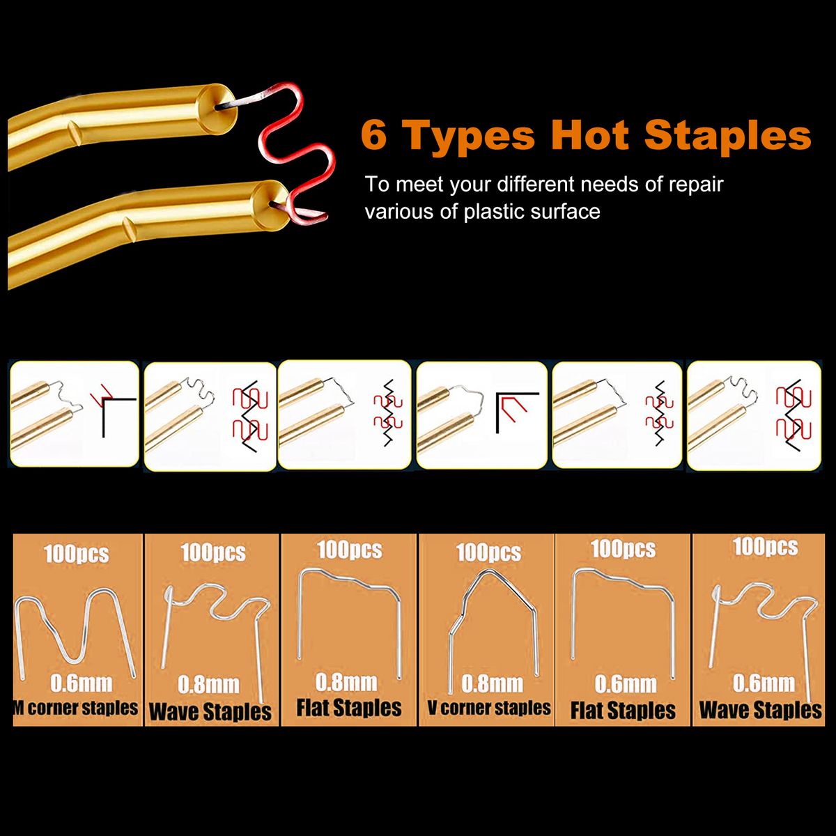 Repairs at least 98% of the plastics on the market. Perfect for repairing: bumper, dashboard, lamp holder, plastic ring, radiator, spoiler, handles, headlights, plastic wings, car and motorcycle plastic device, etc.