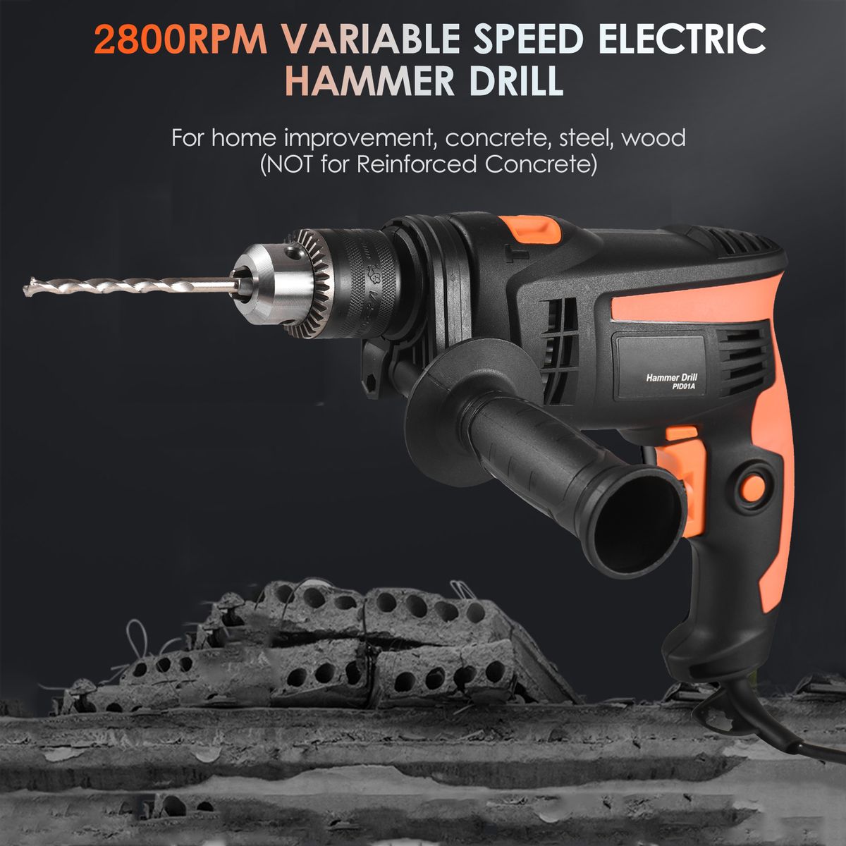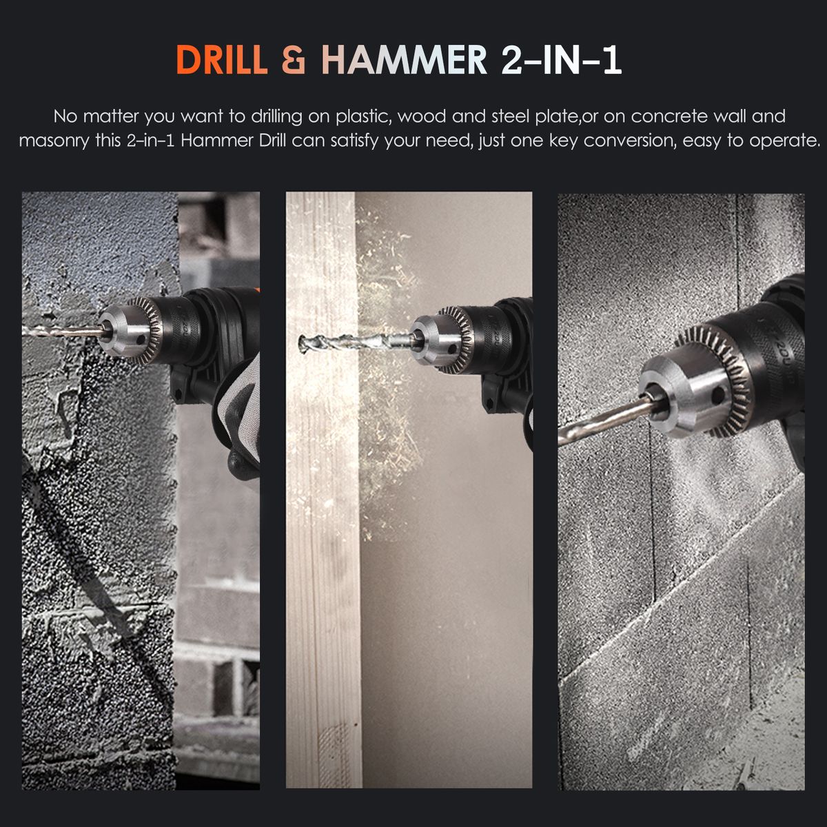 Drill amp; Hammer 2-in-1: no matter you want to drilling on plastic, wood and steel plate, or on concrete wall and masonry this 2-in-1 Hammer Drill can satisfy your need, just one key conversion, easy to operate.
