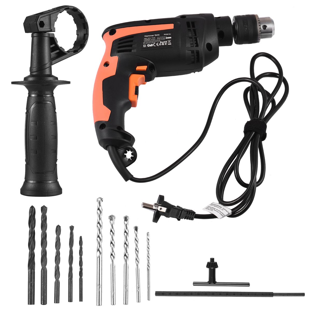 Package Included: 1 * corded hammer drill, 5 * construction drill, 5 * spiral drill for wood.