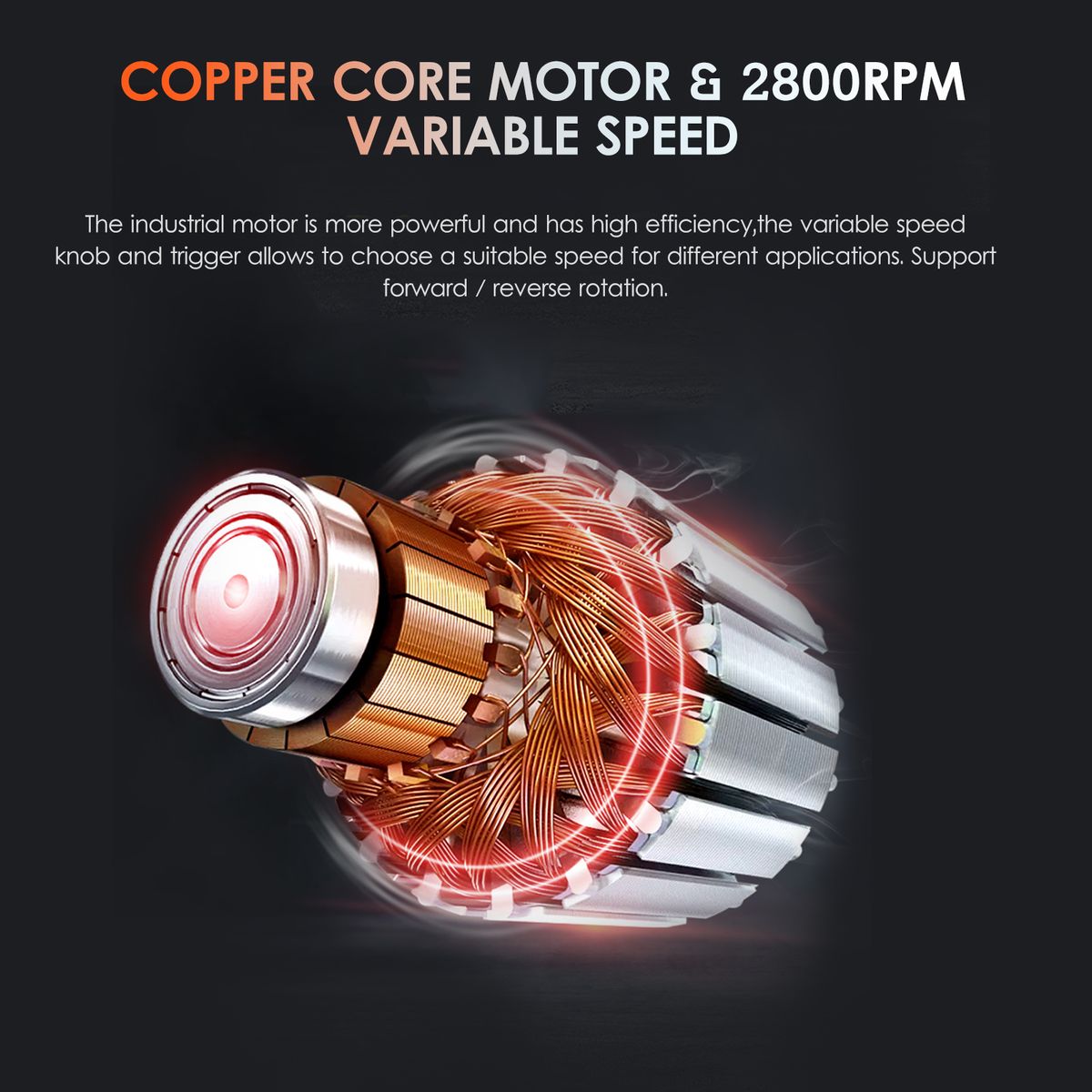 Copper Core Motor amp; 2800RPM Variable Speed: the industrial motor is more powerful and has high efficiency, the variable speed knob and trigger allows to choose a suitable speed for different applications. Support forward / reverse rotation.