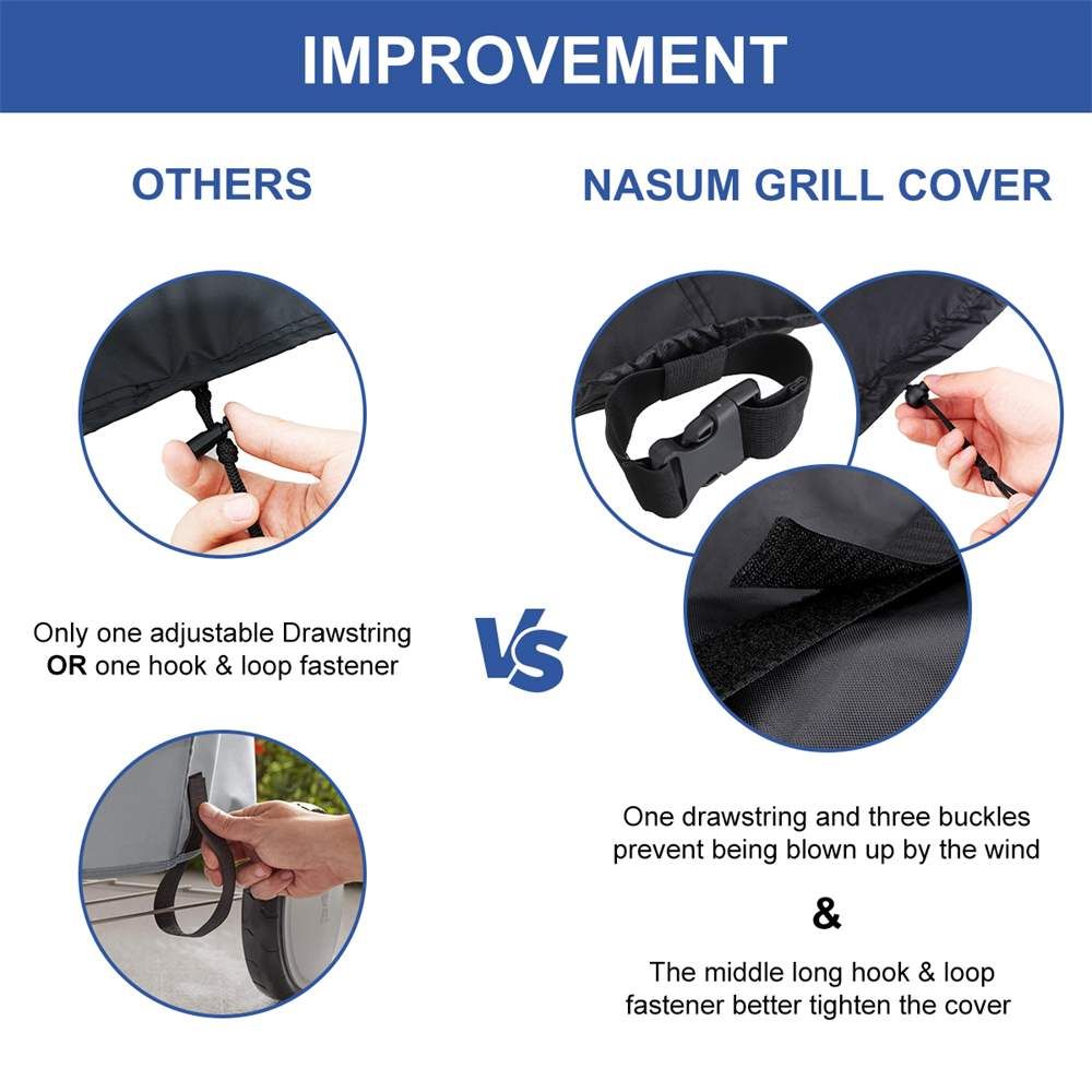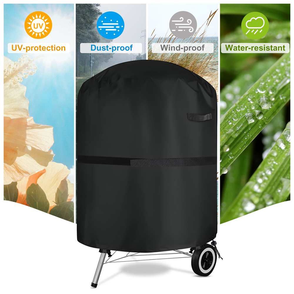 【Fits for most Grills】 -Kettle BBQ Cover is larger than most round BBQ covers on market. size: 28.5x30 inch (72x77 cm) , suitable for most brands of kettle charcoal barbecue BBQ smoker grill on the market. Please check the size of the grill. 【Secure Your Grill Blow Off From Wind】 -there is a drawstring rope at the edge of the round BBQ cover.You can adjust the length by your need. Besides, add one adjustable hook and loop fastener and 3 windproof buckle clip near the bottom to help tighten the barbecue cover, No more worry about your Round BBQ grill cover blowing away in strong winds! Even under harsh envment, your grill can be safe, clean and dry. 【Upgrade Secure Windproof Design】 -The BBQ Cover made of 420D high density nylon oxford fabric which are weatherproof and dust-proof, effectively prevent your grill from getting wet due to rain and snow. This kind material is not easy to tear, it is more powerful to protects your Kettle BBQ Grill from dirt, dust, rain, snow, frost etc 【Rip-Resistant and UV Protection】 -BBQ Cover made of Oxford Cloth material,it has the function of Waterproof when raining and Dust-proof & Anti-UV on sunny day.No matter what kinds of weather, it can prevent the sun wind and rain ,keep the clean. 【Easy to Storage & Clean】 -Simply hose with water and the dirt will disappear soon. Dry up in the sun for use. Comes with a zippered storage bag to keep it conveniently stored when not in use.Please measure your barbecue grill before purchasing.