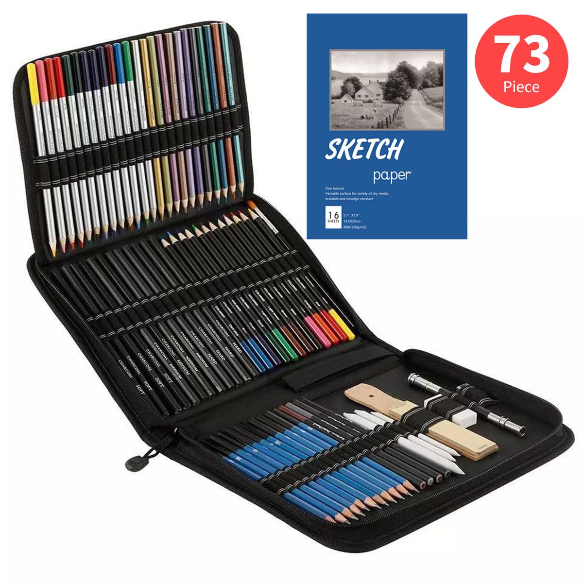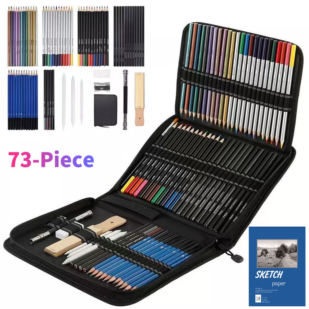 Includes 12 x Metallic Colored Pencil, 12 x Watercolor Pencils, 12 x Colored Pencil, 12 x Charcoal Pencil(Softx4/Mediumx4/Hardx4), 12 x Sketch Pencil(2H/3H/4H/5H/HB/B/2B/3B/4B/5B/6B/8B), 4 x Pastel Pencil, 3 x Paper Blending Stumps, 1 x Sandpaper Board, 1 x Eraser, 1 x Double Head Pencil Extender, 1 x Pencil Sharpener, 1 x Brush, 1 x Sketch Paper.
