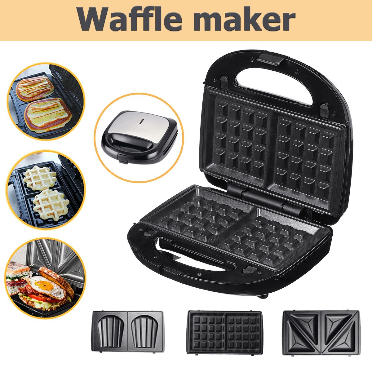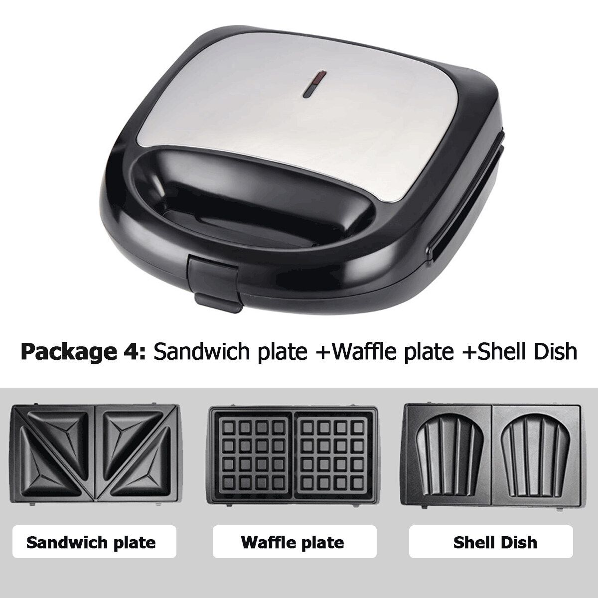 Package Included:1 x Waffles machine,1 x Sandwich plate,1 x Waffles plate,1 x Shell Dish