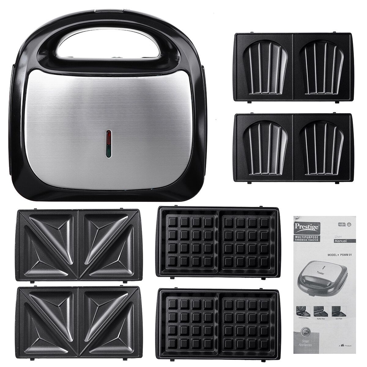 1 x Waffles machine,1 x Sandwich plate,1 x Waffles plate,1 x Shell Dish
