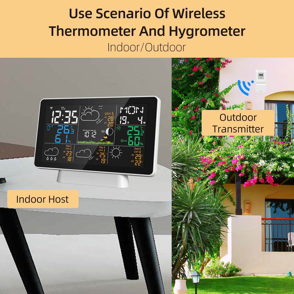 Features:1:7.5" LCD Screen Weather Stations:Newentor temperature and humidity monitor with large color display, which shows comprehensive information: inside outside temperature humidity(max/min, hi/lo), customizable alerts, time/date, alarm clock/snooze, weather forecast moon phase, barometric pressure. New digital prediction, efficient and accurate, six weather displays, efficient and sensitive display of temperature and humidity.