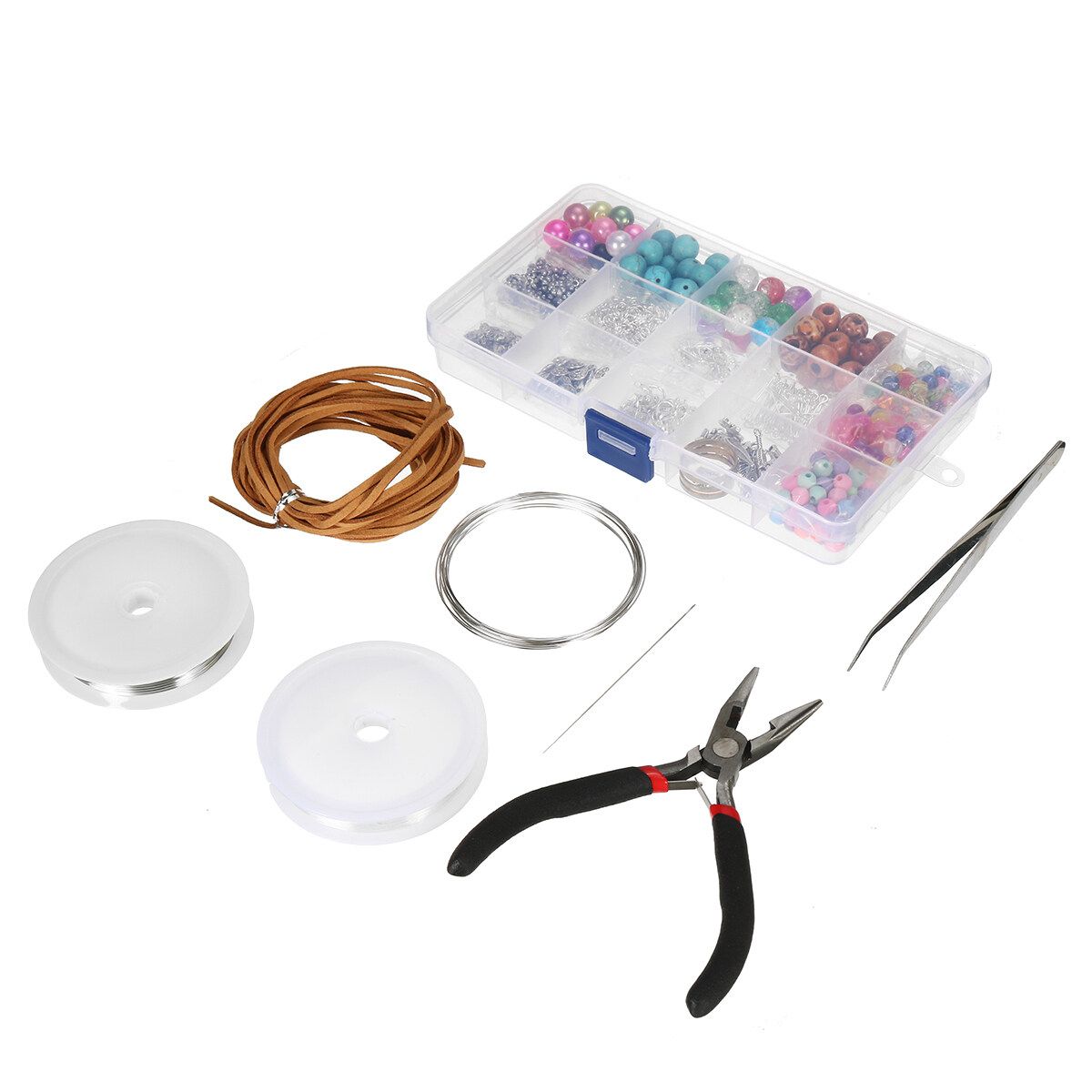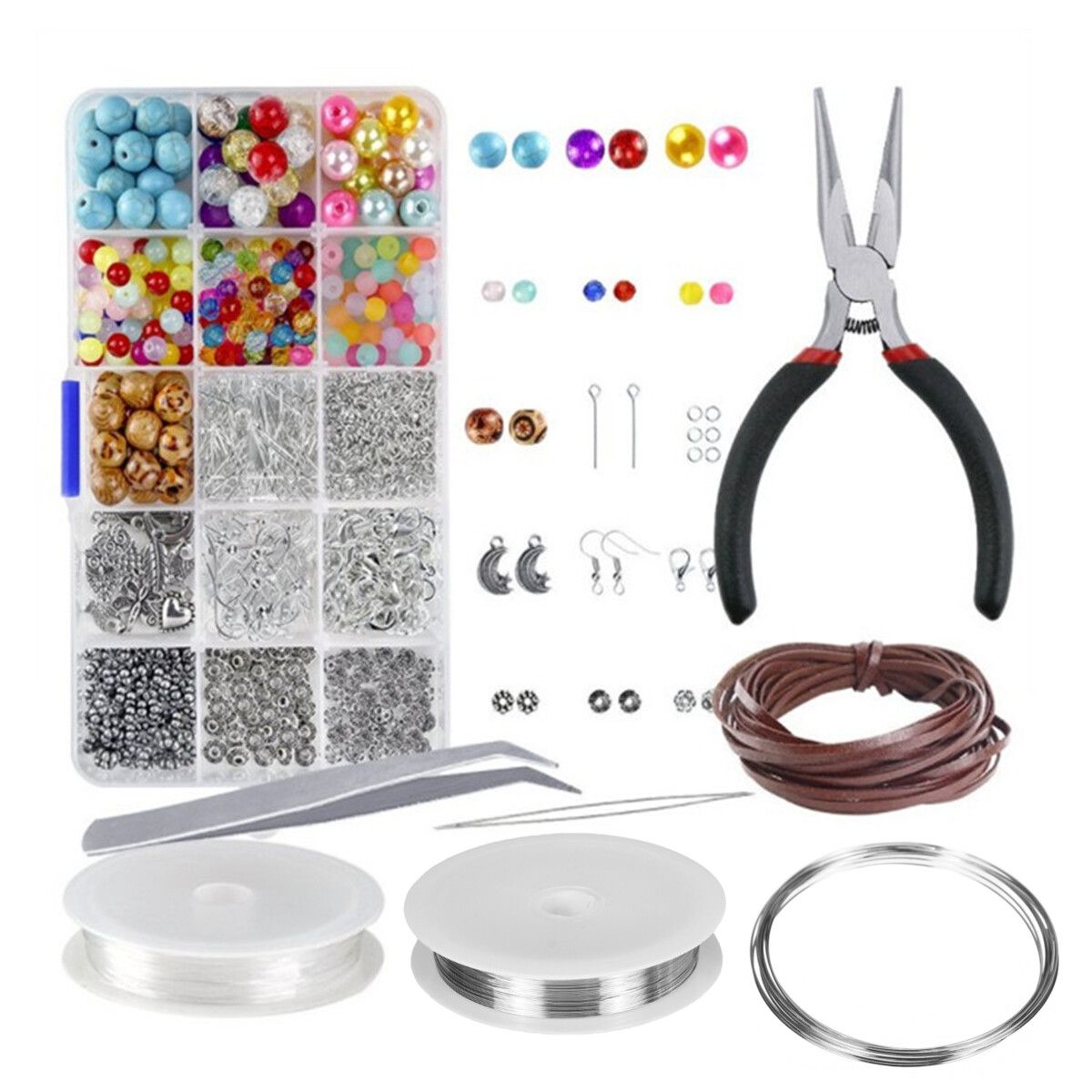 -- 4 kinds beading wire can meet different requirements, includes: Black PU leather cord, reel of silver tiger tail beading wire, reel of clear beading elastic and coils bracelet memory wire