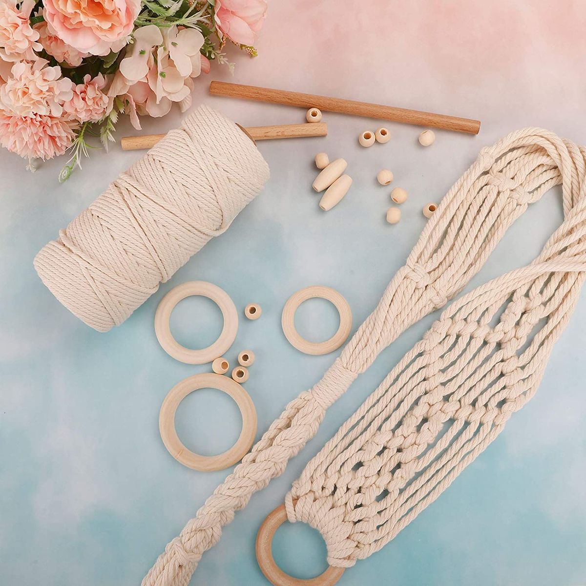 Macrame Cord Hanging Kit: Includes 109-yard 3mm cotton macrame cord, 60 round wooden beads, 10 oval wooden beads, 4 wooden rods, 4 wooden rings. Super Set for your crafts.
