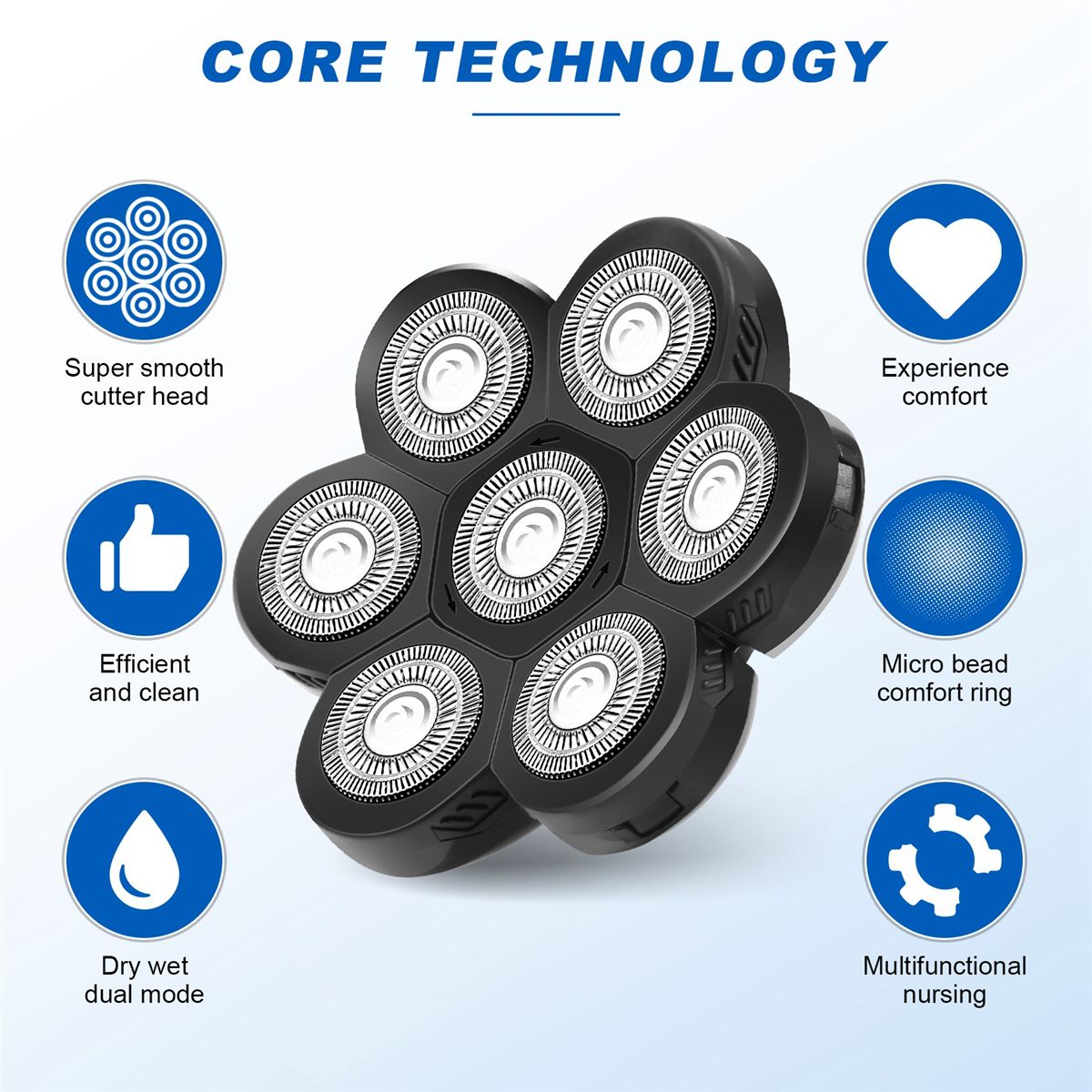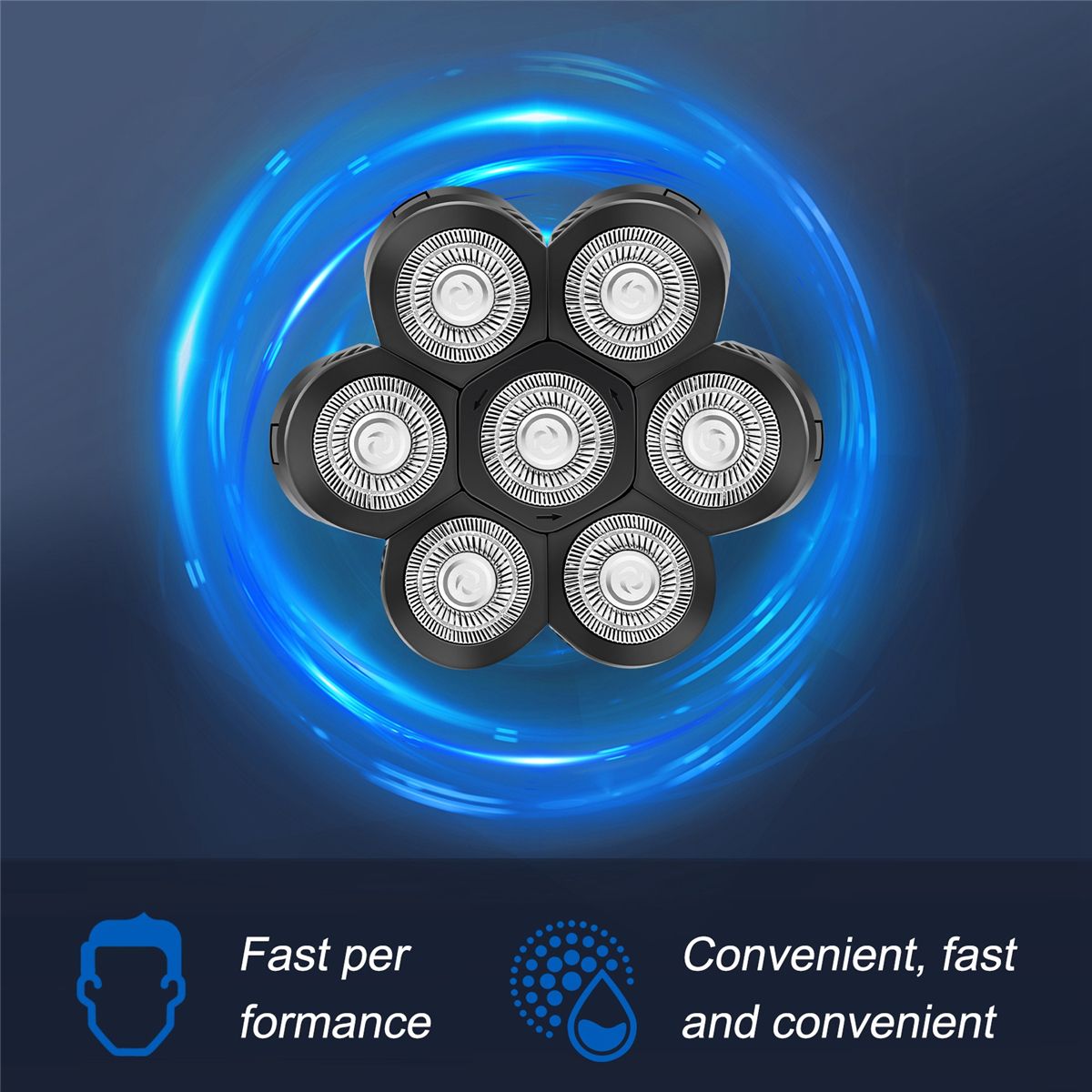 Detailed Information About The Product:1. 7 blade heads, 7D larger contact surface, faster shaving,bring you faster and cleaner shaving process. Easy to use, just snap on and shave Washable, easy to clean.