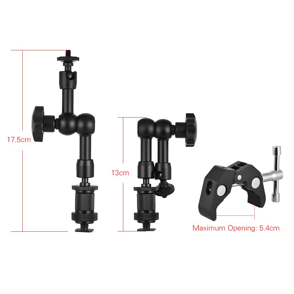 7inch friction arm and clamp mount for connecting camera and monitor/LED light/flash amp; etc The hot shoe mount is removable. 360 deg; rotary swivel knuckle enable you to adjust angle easily.