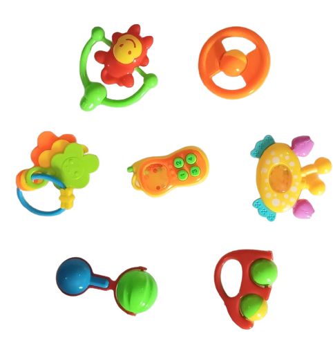 Colourful and lovely rattles will easier to capture your baby's attention to grasp, shake and teether, developing their motor skills and cognitive ability.Bright Primary coloured Rattles/Teethers for different stages of baby's development. Each rattle has different grips, shapes and tasks to assist in fine motor skills. Variety of textures will assist in tactile development of touch. Numerous sounds will expand babies' sensory experiences, colours and patterns help eye tracking skills. Great gift for baby showers, suitable for nursery child care - easy to clean and store hygienically in their own container. Great stroller toy. Designed for babies: These baby teether toys and rattles come in a variety of fun patterns,