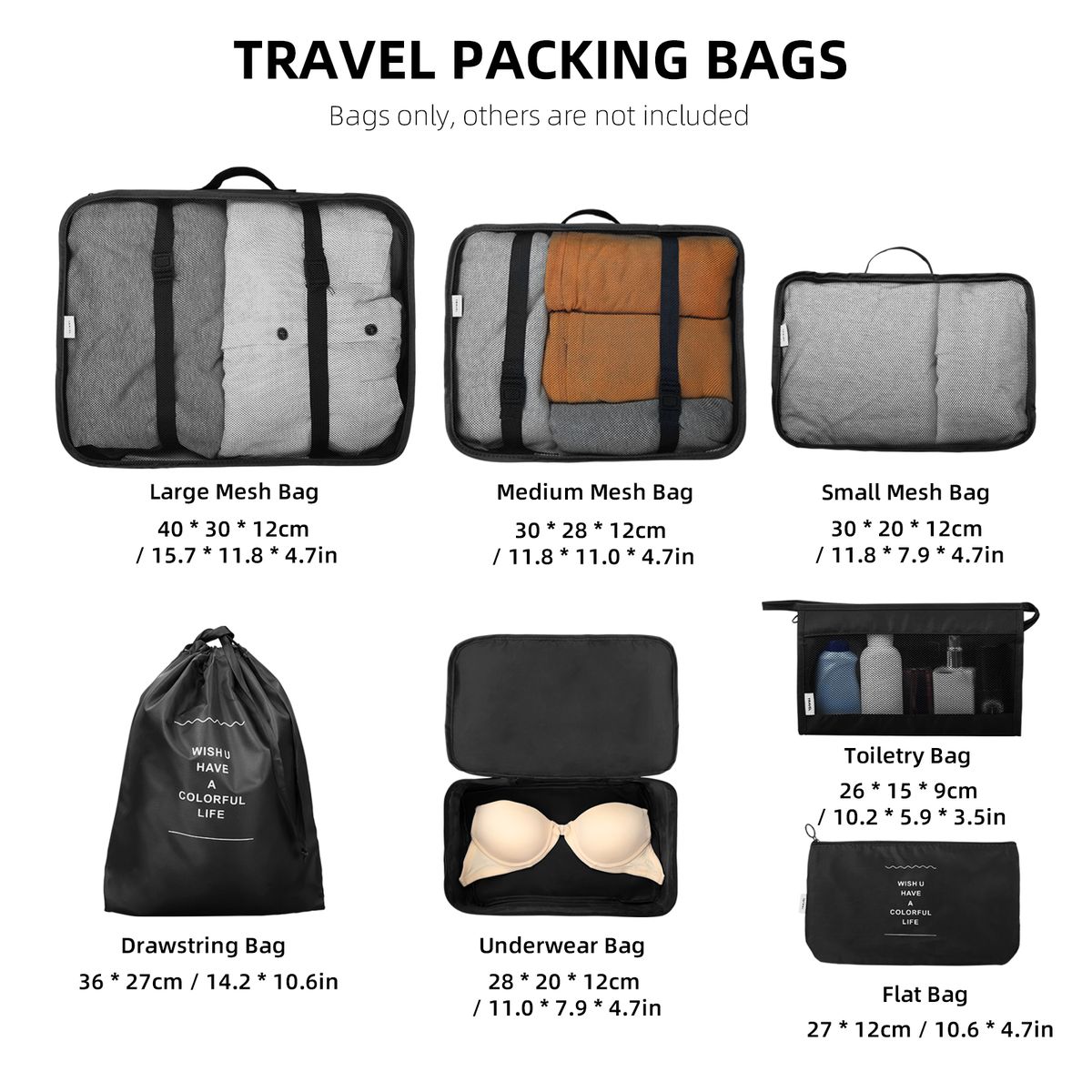 1 x Large Mesh Bag,1 x Medium Mesh Bag,1 x Small Mesh Bag,1 x Drawstring Bag,1 x Underwear Bag,1 x Toiletry Bag,1 x Flat Bag