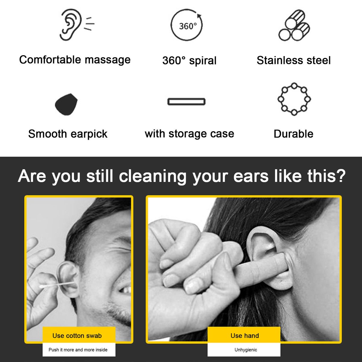 Features:7pcs high-quality stainless steel Ear Cleaner, 360°cleaning ear canal, massage your ear canal, relieve itching during cleaning, keep your ear canal clean and healthy.