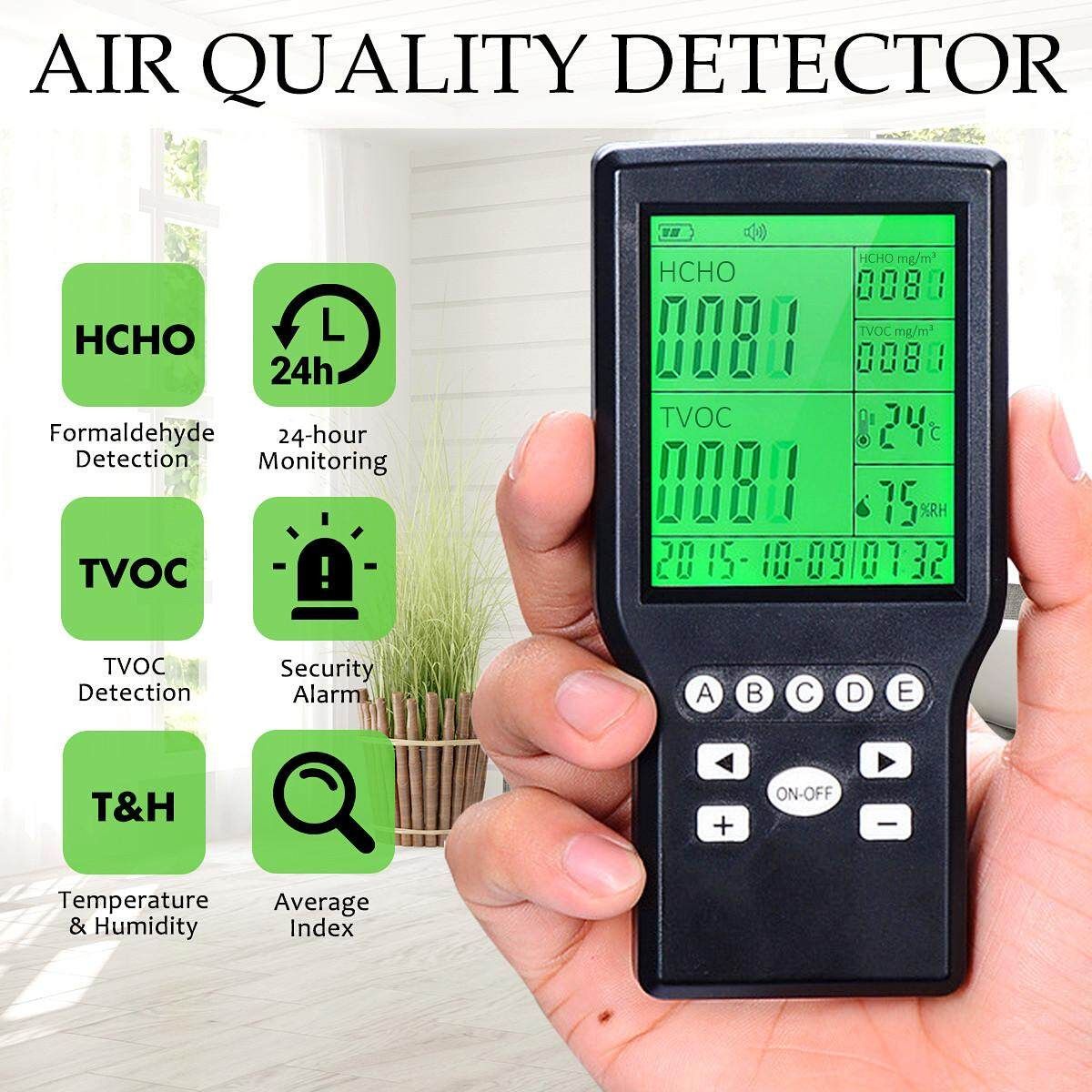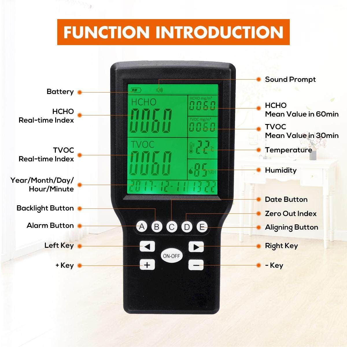 - 8-IN-1 Function: Formaldehyde ; Hazardous substances in the air ; TVOC ; Toluene ; Chemical contaminant ; Temperature; Humidity; Mean-value record.