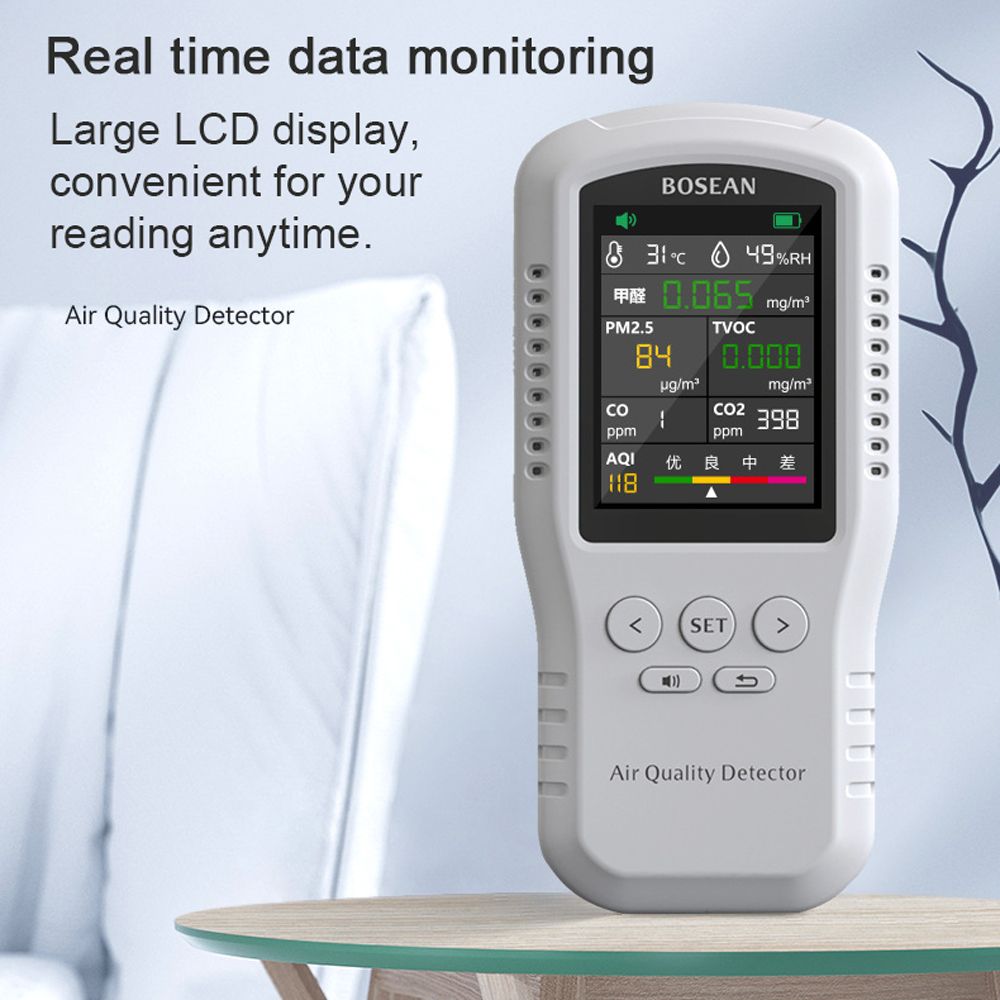 This is a multifunctional home air quality detector, mainly used to monitor PM2.5, HCHO, TVOC, CO and CO2 concentrations in air, and temperature and humidity. The instrument is equipped with a 3.2-inch color LCD display and a voice alarm prompt.