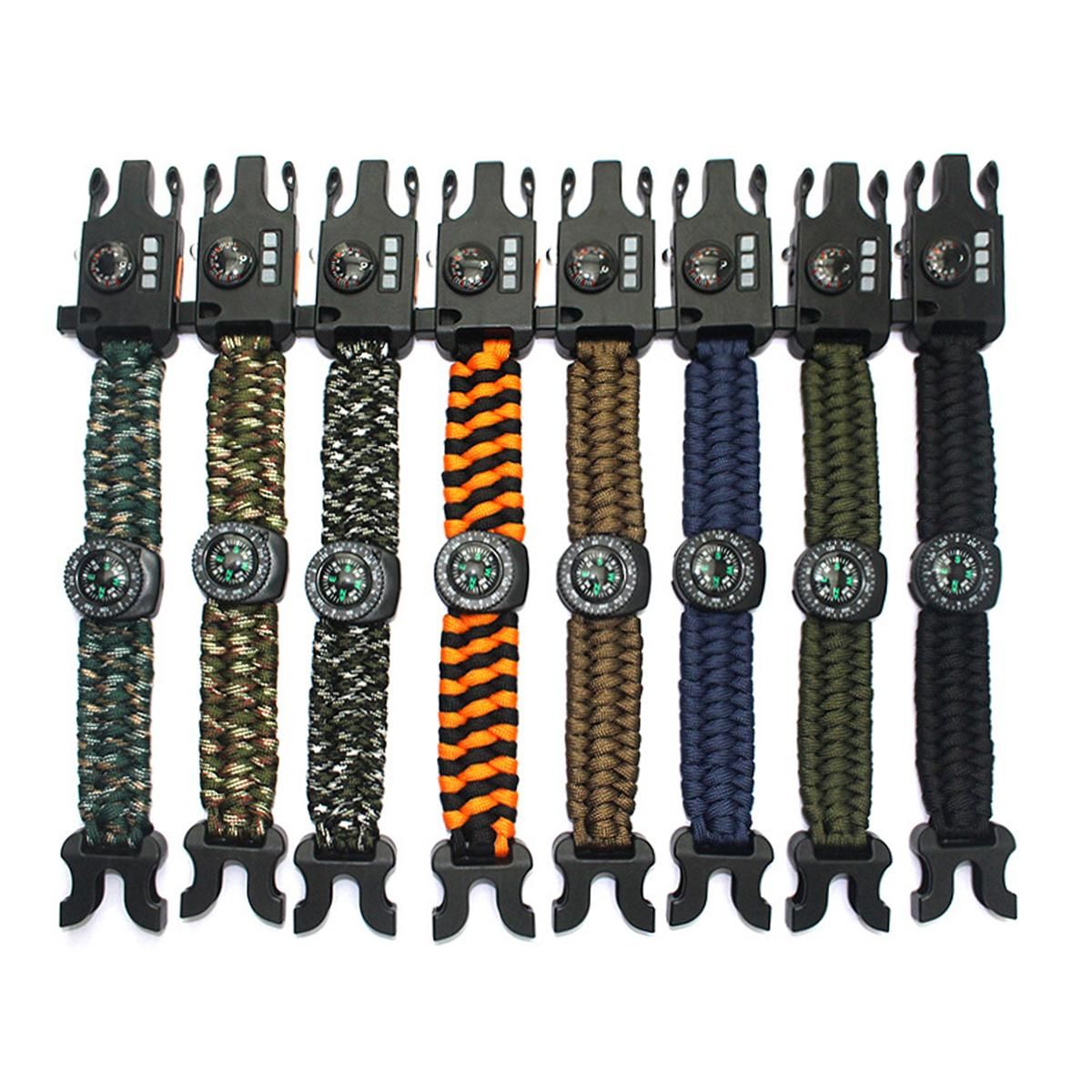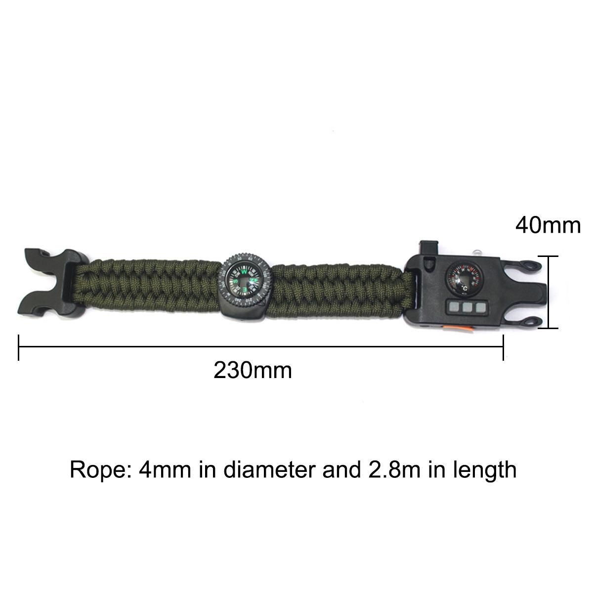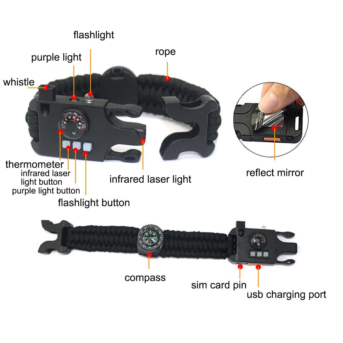 1.8 IN 1 SURVIVAL EMERGENCY KIT: The outdoor survival bracelet with compass, loud Whistle, LED fashlight, laser infrared, violet light, reflect mirror, SIM card pin.thermometer.