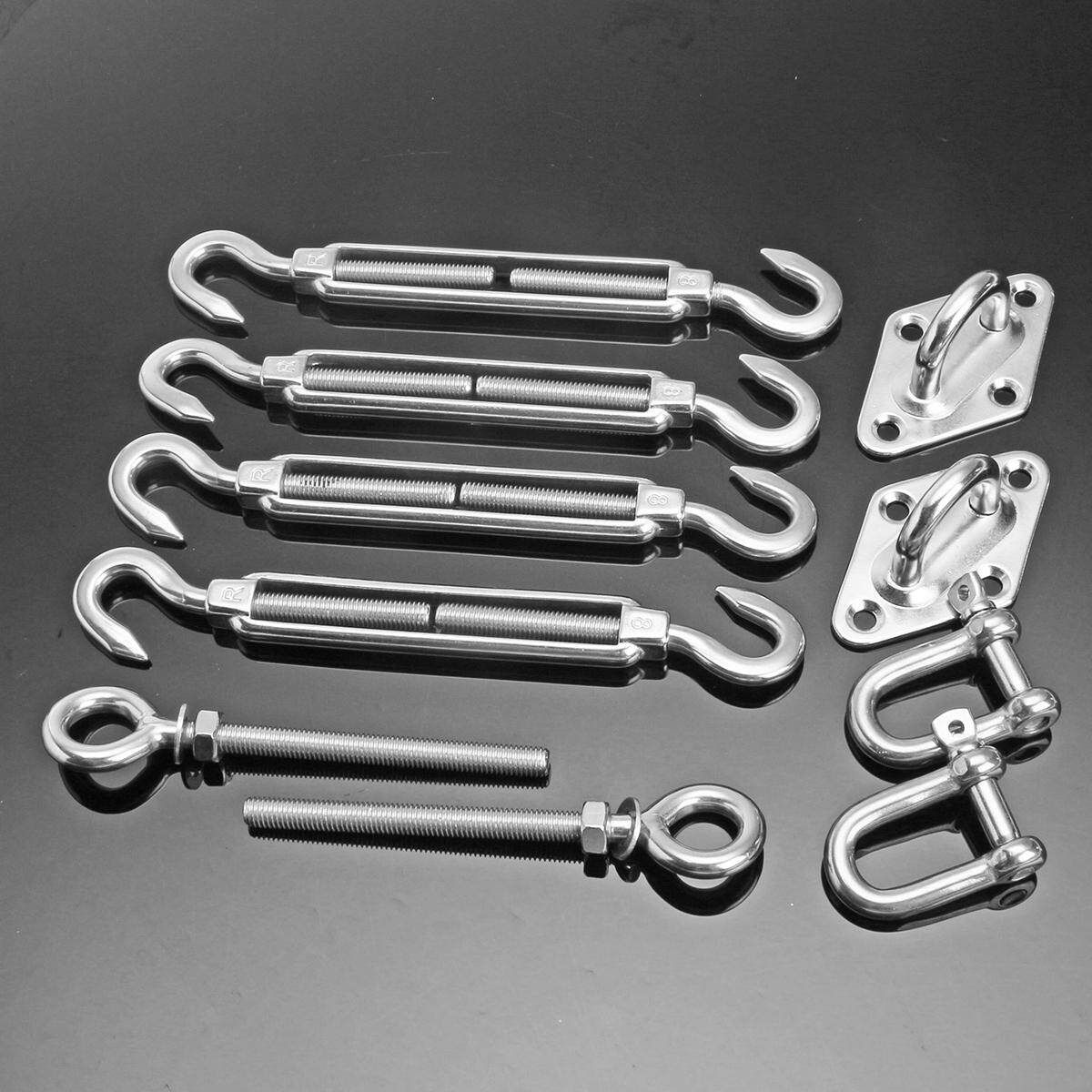 SSFK 2-8 mm marine grade stainless steel sail mounting kit Technical Specifications: Material:304 Stainless steel : Silver Features and Benefits: ● Made of 304 stainless steel, not easy to rust. ● Easy to operate. ● Adjustable turnbuckle helps create tension. ● Suitable for garden patio awning canopy sunscreen. ● This fixing kit is specifically designed for use with a triangle shaped sun shade / garden awning / garden canopy.