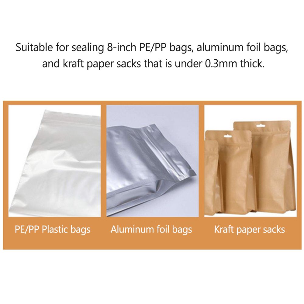 Suitable for sealing 8-inch PE/PP bags, aluminum foil bags, and kraft paper sacks that is under 0.3mm thick.