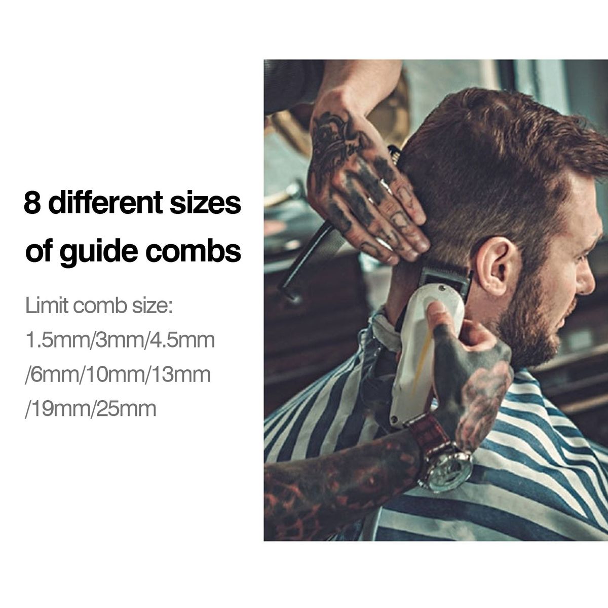 With 8 different sizes(1.5mm-25mm) of guide combs, you are free to choose the size you like.
