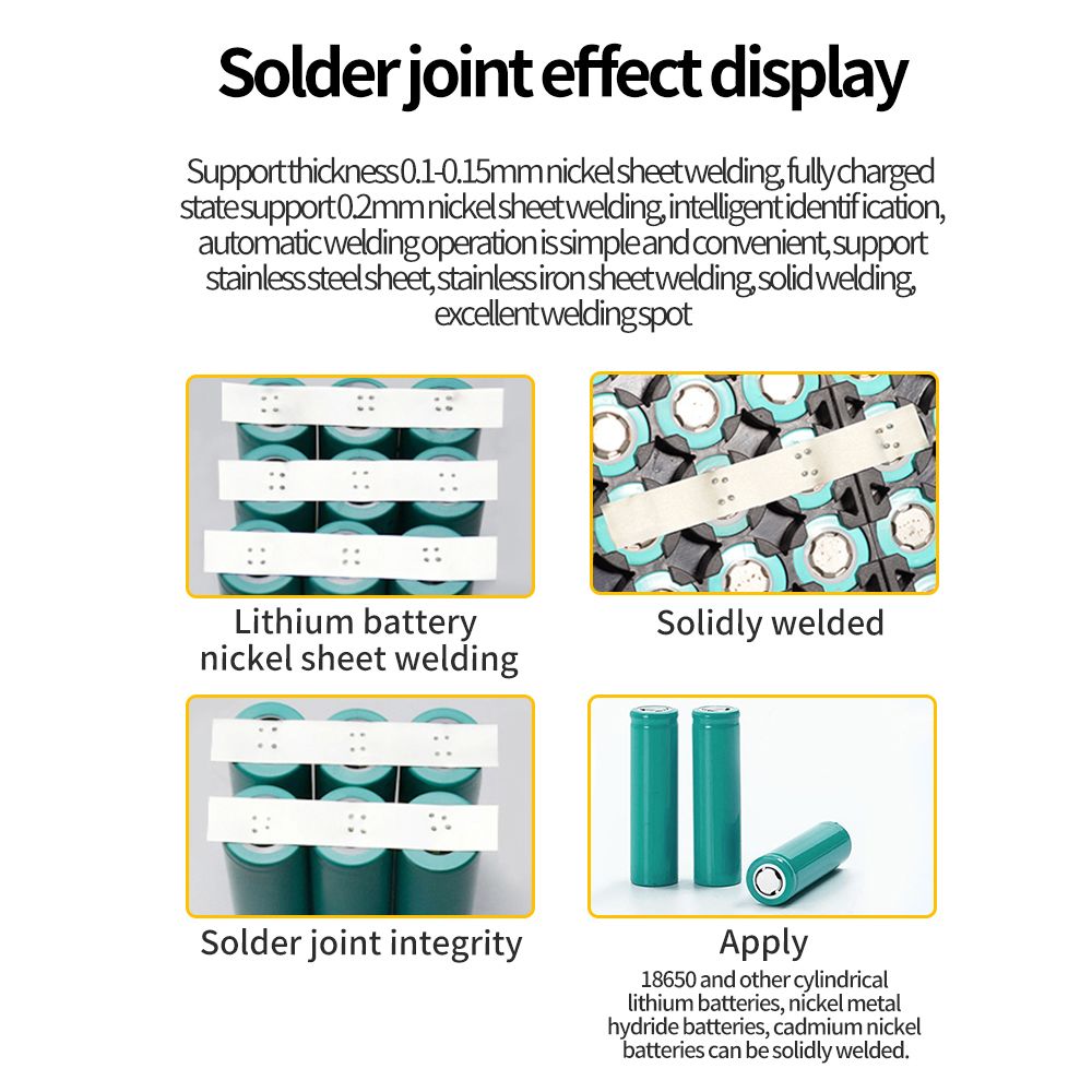 High Current: The design current is about 800A max, it supports welding 0.1-0.15mm(0.2mm under full battery condition) nickel sheets, stainless iron sheets or stainless steel sheets, with solid and beautiful welding spots.