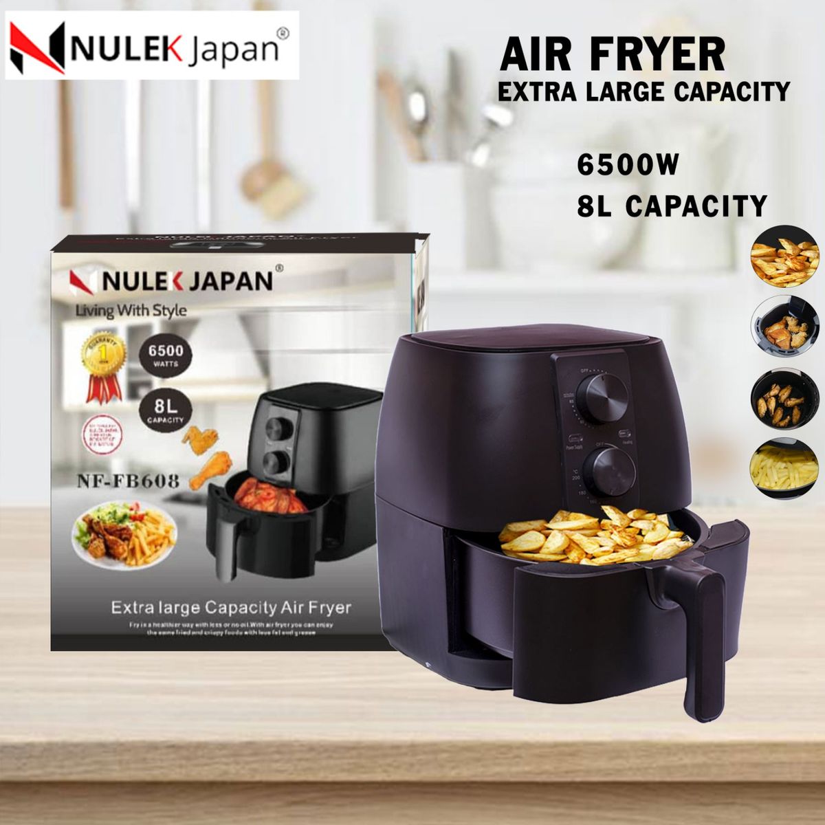 The Nulek 8L Air Fryer helps you reduce up to 80% of your fat intake enabling you to fry food without the need of oil. It features rapid air technology, an adjustable temperature control and a 30 minute timer that helps you pre-set your cooking time. The Integrated air filter keeps your kitchen fresh and clean while parts of the air fryer are removable and dishwasher safe. Included is a recipe booklet to help you kick start your healthy cooking regime.Cooking deliciously is not enough anymore. Healthy cooking is the new life hack! This Air Fryer with Rapid Air Circulation Technology will be your new kitchen assistant with 80% fat free cooking even with deep fried food. Fry fish, chicken, meat or potatoes with this quick and easy Air Fryer in a jiff. Enjoy Oil-free toasting!The Air Fryer helps you reduce up to 80% of your fat intake enabling you to fry food without the need of oil. It features rapid air technology, an adjustable temperature control and a 30 minute timer that helps you pre-set your cooking time. The Integrated air filter keeps your kitchen fresh and clean while parts of the air fryer are removable and dishwasher safe. Included is a recipe booklet to help you kick start your healthy cooking regime.Cooking deliciously is not enough anymore. Healthy cooking is the new life hack! This Air Fryer with Rapid Air Circulation Technology will be your new kitchen assistant with 80% fat free cooking even with deep fried food. Fry fish, chicken, meat or potatoes with this quick and easy Air Fryer in a jiff. Enjoy Oil-free toasting